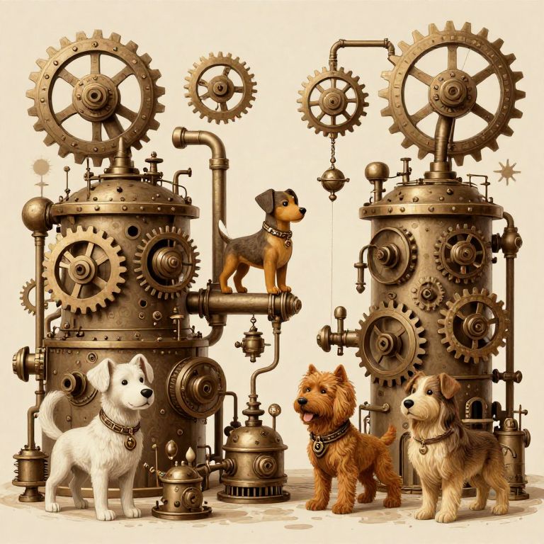 Dog generator breed illustrated as a whimsical factory producing a variety of unique dog breeds, steampunk style with gears and pipes, warm sepia tones, intricate craftsmanship, blending fantasy and mechanical inventiveness.