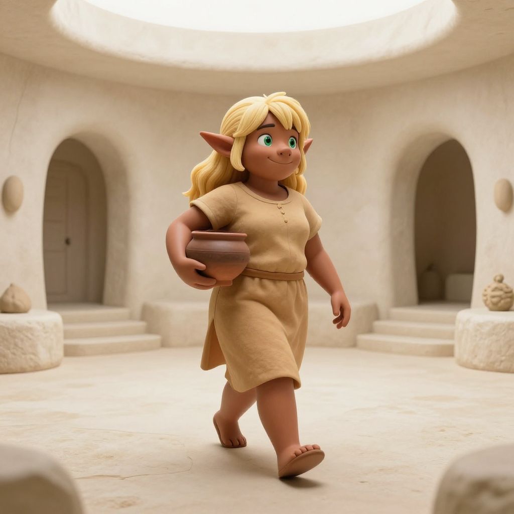A CGI image of a cute, fantasy-style elf girl with light brown skin, long blonde hair, and large pointed ears. She wears a simple, beige, short-sleeved tunic dress and is barefoot. She holds a brown clay bowl in her right hand and walks confidently in a circular, white-walled room with arched doorways and stone steps. The room is lit by a bright, circular overhead light, casting soft shadows. The elf girl has big, green eyes and a slight smile, exuding a friendly, approachable vibe. The background is minimalistic, focusing attention on the character.