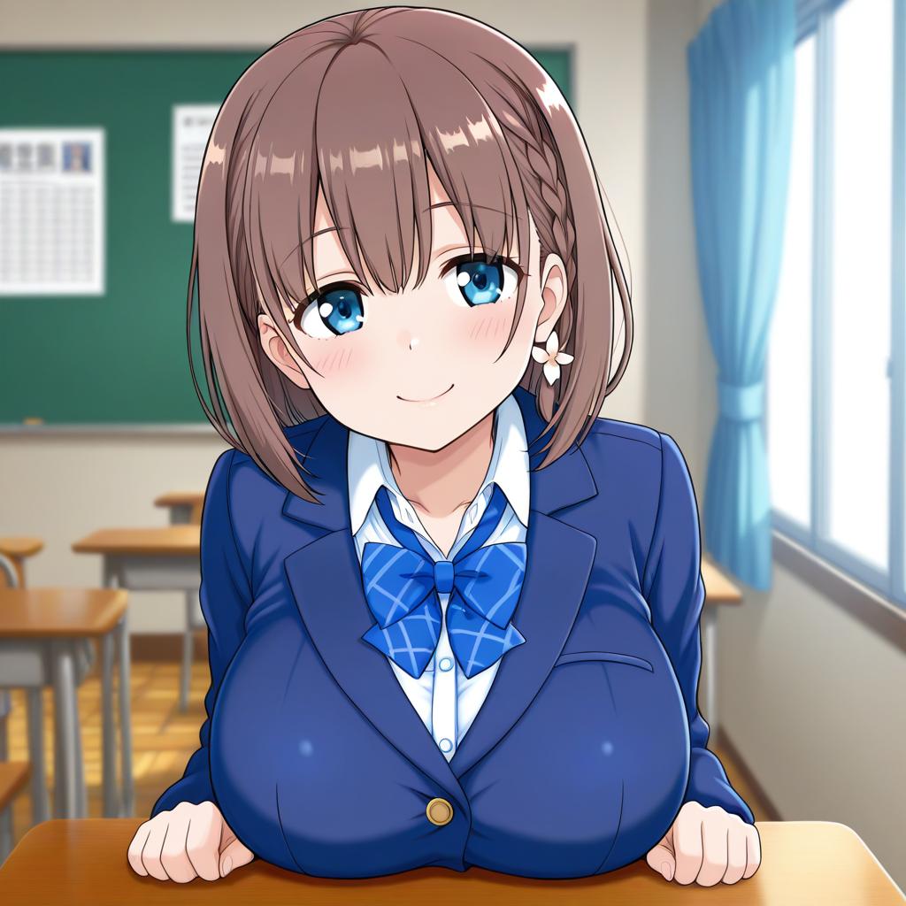 Illustration of a young anime girl with short brown hair and a side braid, featuring large blue eyes and wearing a blue school uniform with a white shirt and a large blue checkered bow. She is seated in a classroom setting with desks, a green chalkboard, and blue curtains by the window. The girl has a cheerful expression and is leaning on a wooden desk.