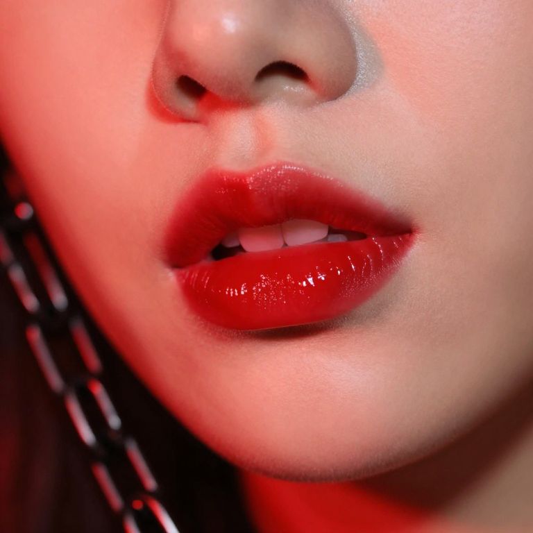 Close-up photograph of a woman's lips with glossy red lipstick, partial nose, and black chain on the left, in red lighting.