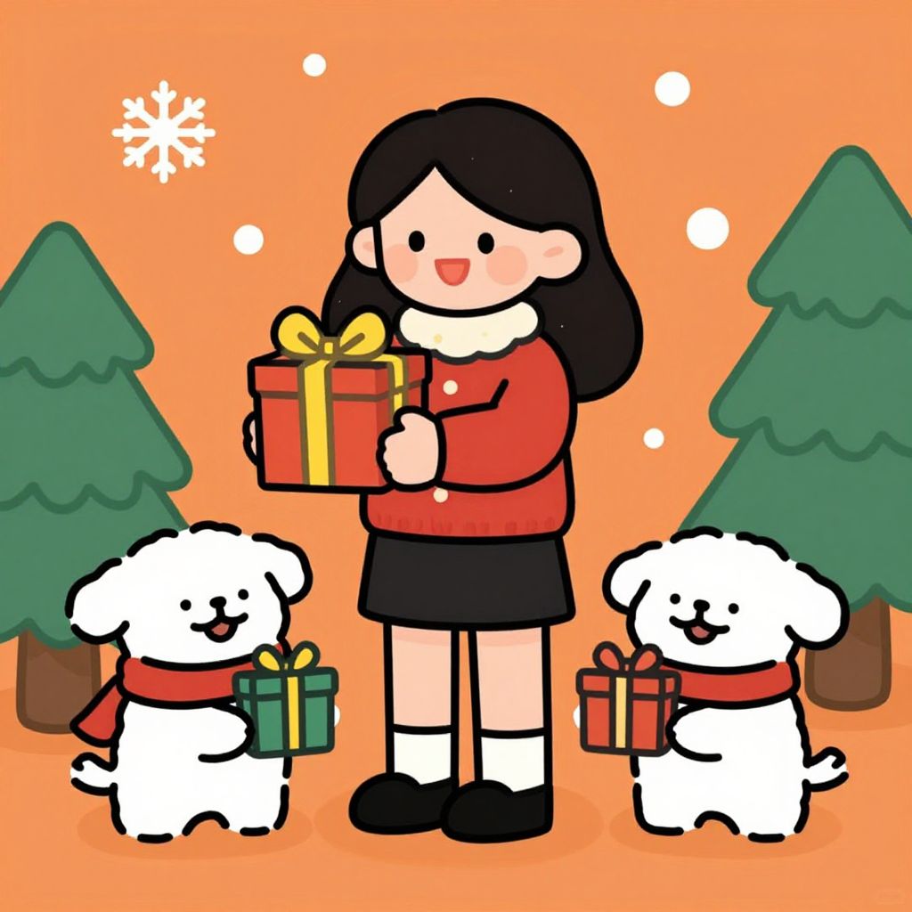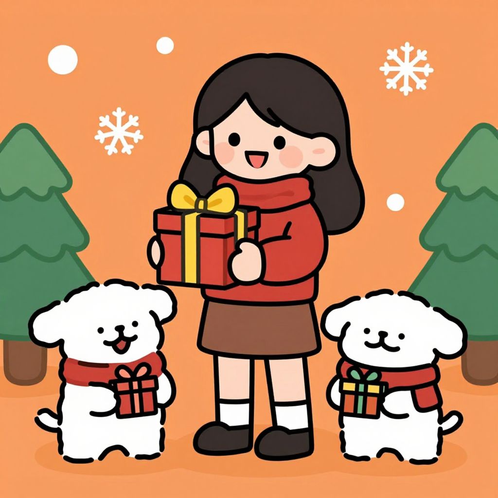 A vibrant cartoon-style illustration by Koh Chip Whye captures a festive Christmas scene featuring a cheerful woman holding a gift box adorned with a yellow bow, standing beside two adorable white dogs wearing scarves and holding small presents, all set against a warm orange backdrop with snowflakes and pine trees, evoking a cozy holiday atmosphere.