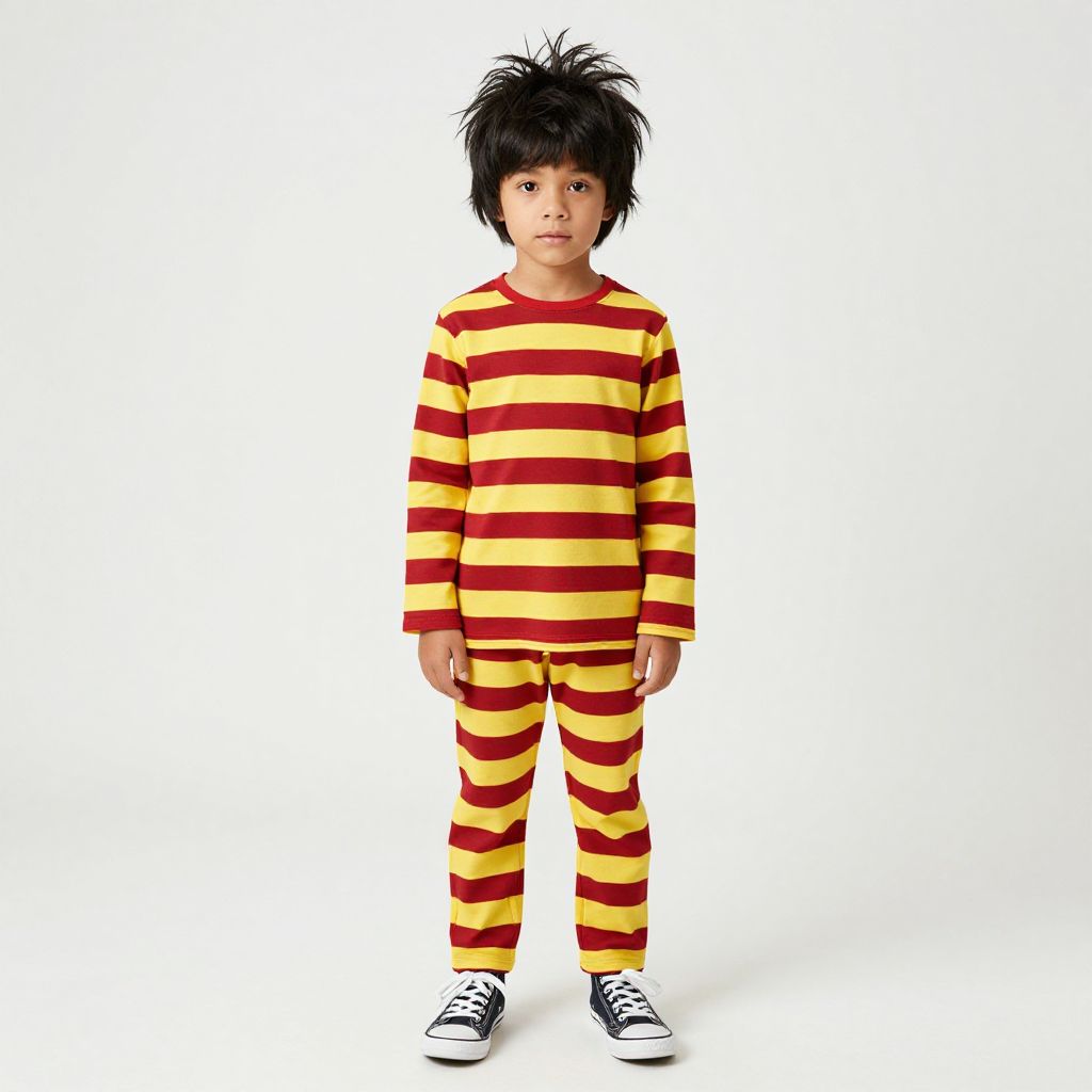 "seuss kid horton costume, solo, black hair, male focus, shoes, 1boy, sneakers, full body, realistic, simple background, standing, child, striped clothes, white background, messy hair, long sleeves, looking at viewer Realistic photo of casual sexy person with pretty face"