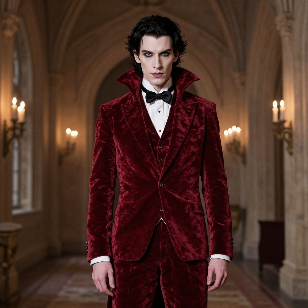Male handsome vampire with alabaster skin and dark, tousled hair, wearing a Victorian-style crimson velvet suit, elegant and poised in an ancient castle hallway, candlelight flickering, dramatic shadows enhancing his enigmatic charm and supernatural aura.