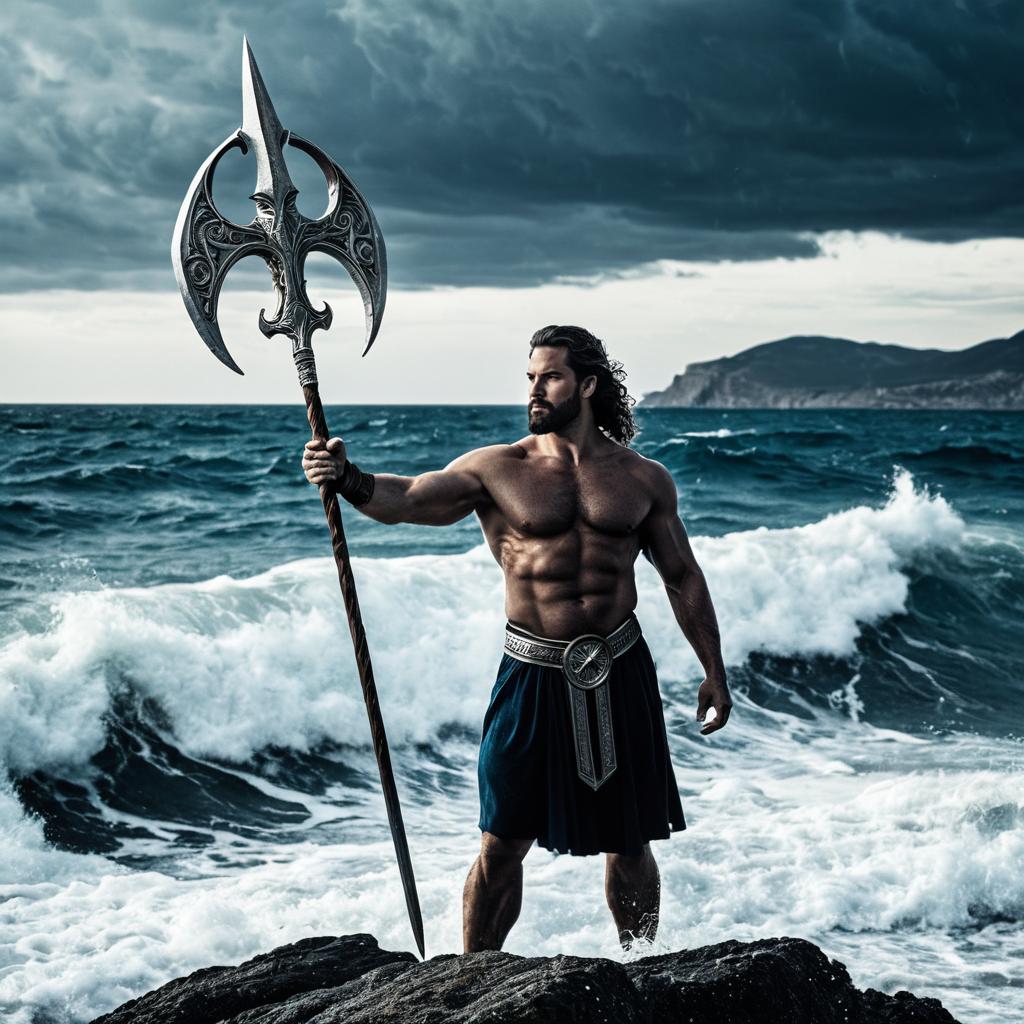 Majestic Greek goddess standing powerfully in front of a crystal-clear sea with sparkling waves. He holds a silver trident firmly, symbolizing his authority over the ocean. The god has a delicately curled goatee representative of Greek demigods, and his expression is resolute and intense. The scene is rendered in a dramatic, mythological style, with powerful waves and stormy skies in the background, emphasizing his divine presence and command over nature.