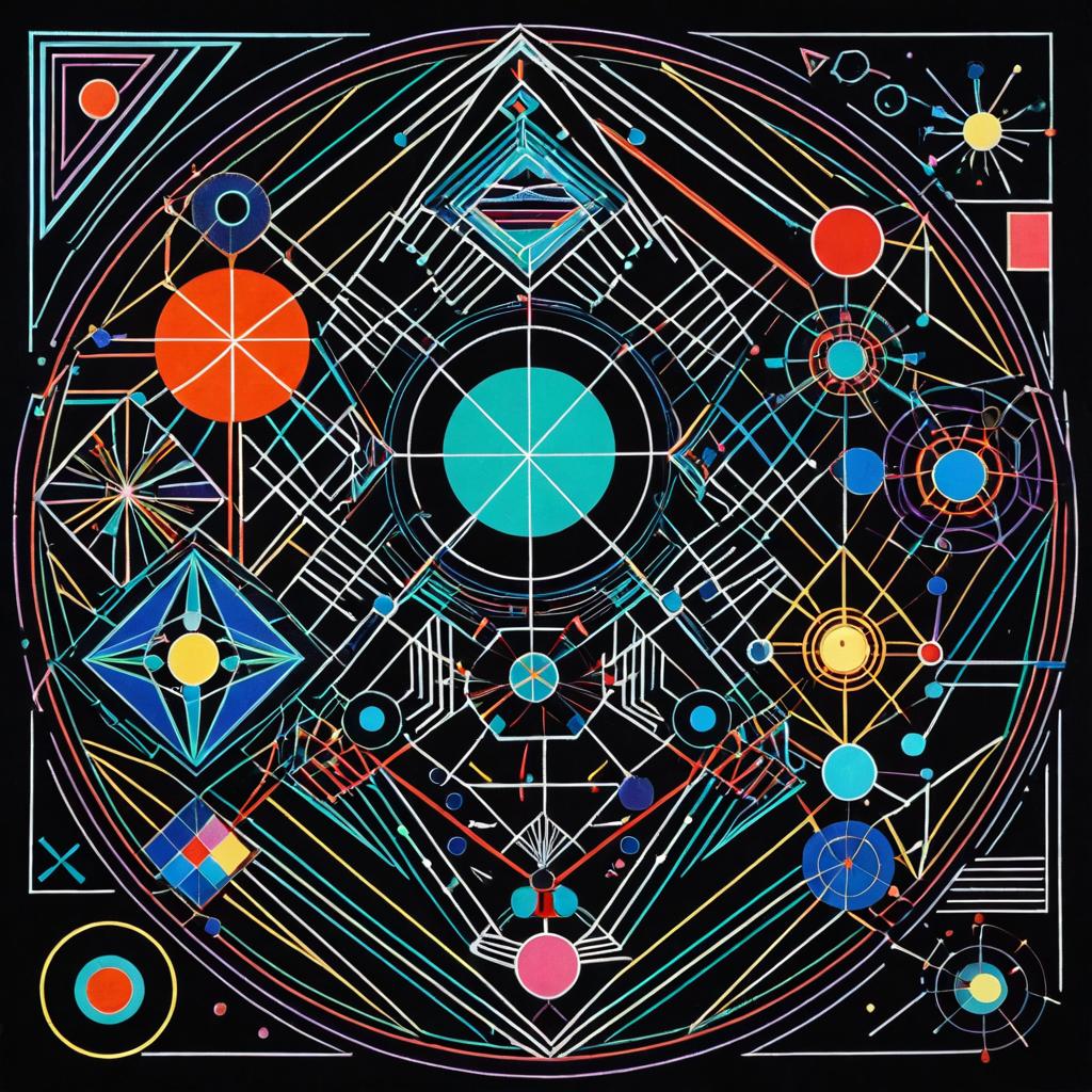 Abstract diagram featuring geometric crystal shapes interconnected with intricate circuitry lines. The composition utilizes vibrant neon hues and combines elements reminiscent of Wassily Kandinsky and Sonia Delaunay's styles, with a complex and dynamic layout on a black background.