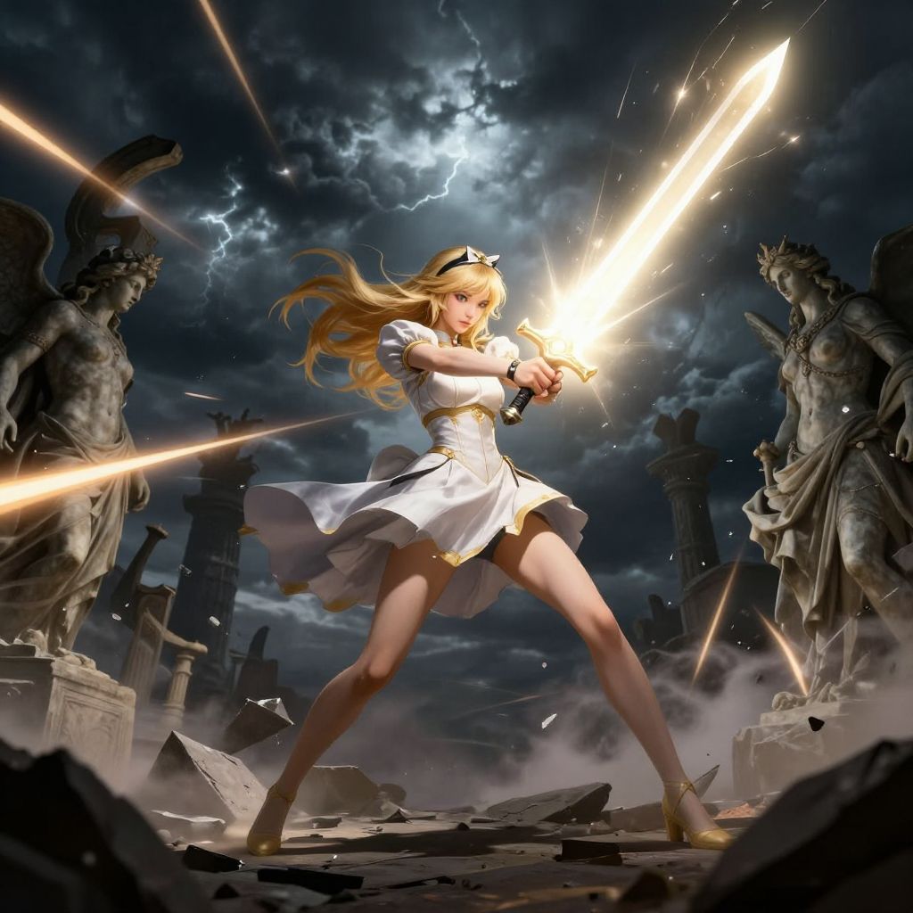 Dynamic battle scene featuring Alice Divinity 2 wielding a radiant sword of light, dark stormy skies, shattered statues of gods around, intense energy beams, dramatic shadows, high detail digital art
