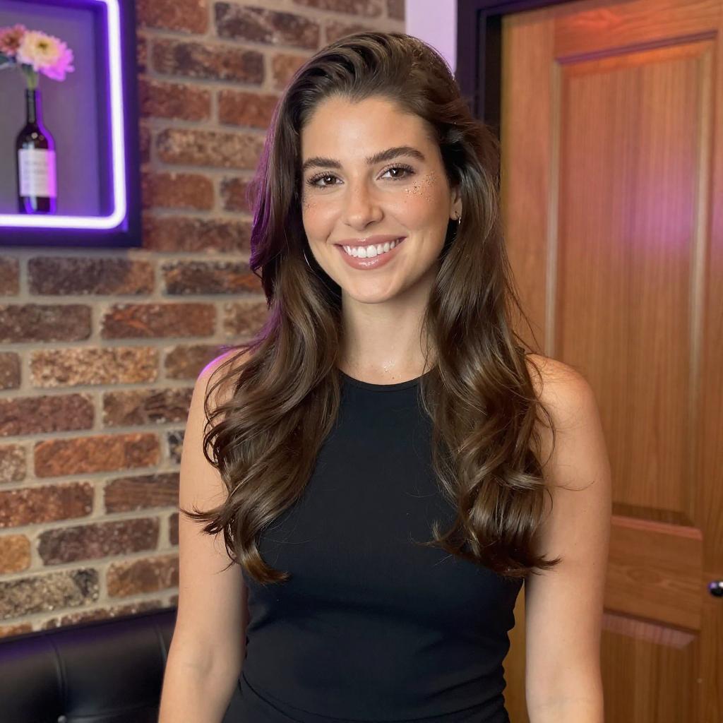 Photograph of a smiling woman with long, wavy brown hair and fair skin, wearing a sleeveless black top. She has sparkling glitter on her face and is standing in front of a brick wall. The background includes a neon-lit picture frame with a bottle and flowers, and a wooden door with orange lighting. The image has a bright, high-contrast look.