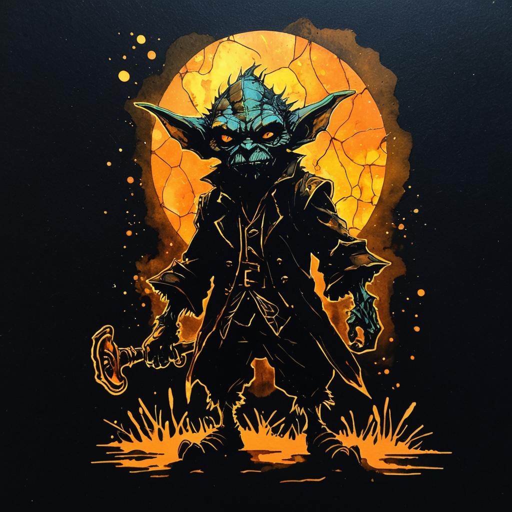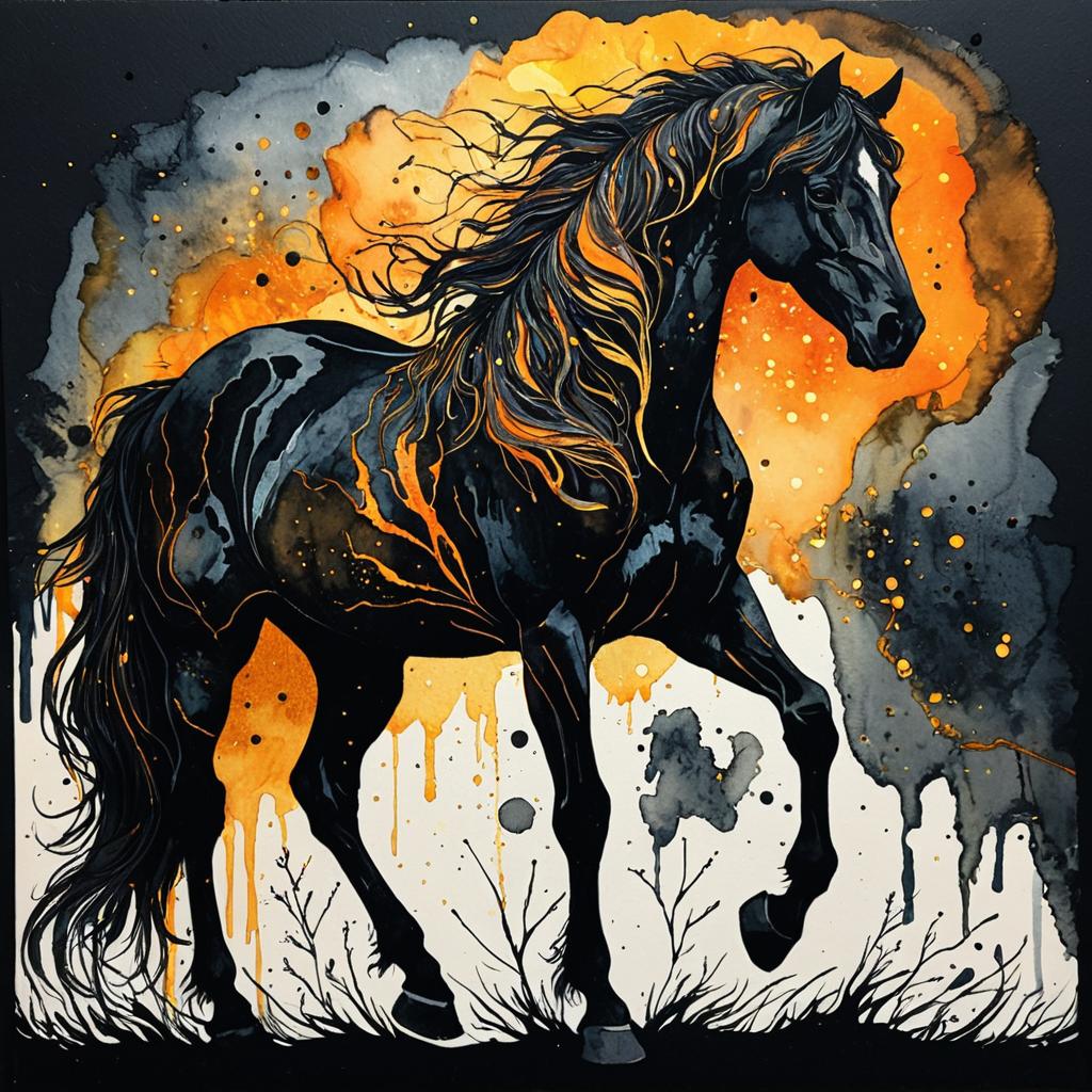 Silhouette art of a shadowy samurai in an alcohol ink sketch, dark hues with glowing orange and gold accents, glossy, full-length shot, intricate linework