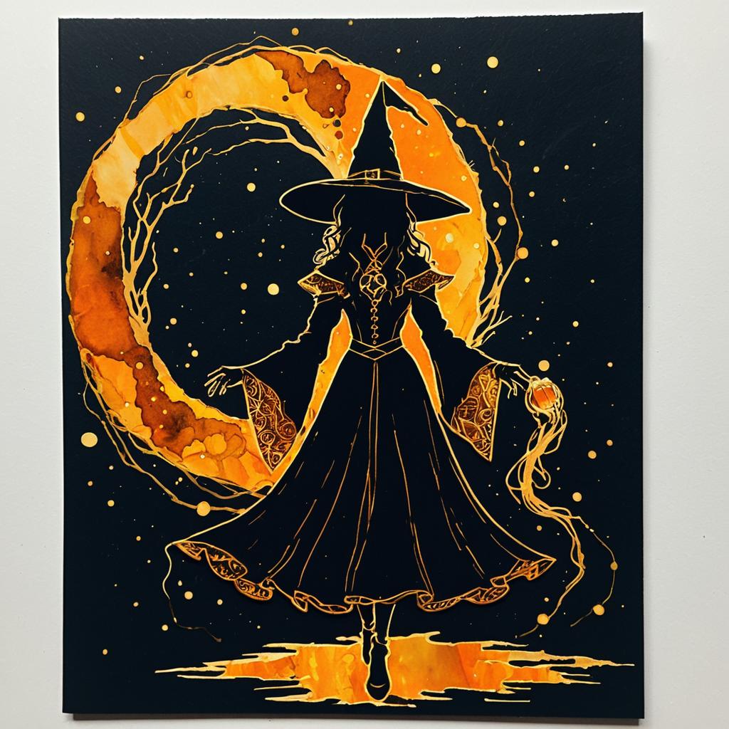 Artistic silhouette of a shadowy samurai wearing traditional Japanese armor and a conical hat, holding two katanas. The background features a glowing orange and gold alcohol ink effect, resembling a full moon with intricate linework and glossy details on a dark background.