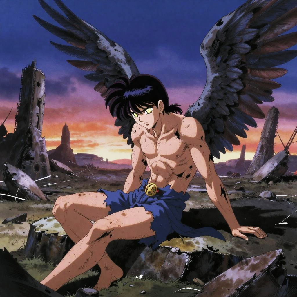 Anime-style drawing of a muscular, shirtless, black-winged man with dark hair, sitting on rubble at sunset in a ruined cityscape.