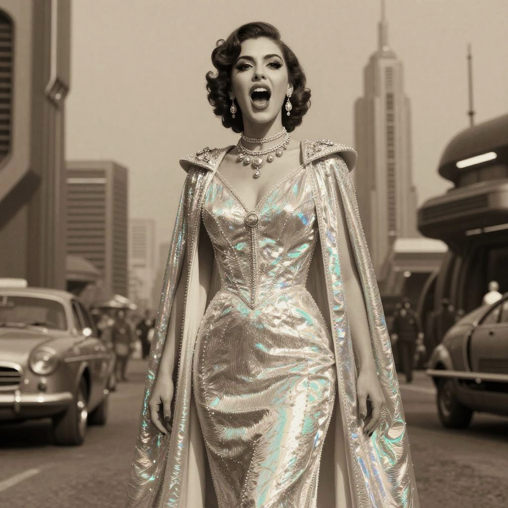 Realistic photo.Trim Mira, sci-fi heroine photography by David LaChapelle, clear facial features, full body shot, 1940s sepia photograph, very close-up portrait looking straight at camera, beautiful fearless Middle-Eastern woman, wearing holographic cape screaming, in the style of futuristic surrealism, heavy makeup, futuristic jewelry, high fashion, vogue, futuristic city in the background, very detailed, cinematic, realistic, Sony A7R IV, Velvia, cinematic lighting, hyperrealistic realistic photo