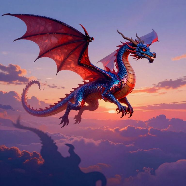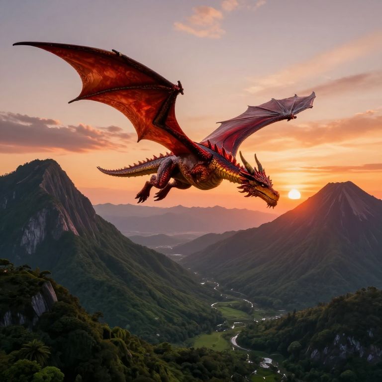 Craft an image reminiscent of post-impressionist art, depicting a grand dragon soaring through a tranquil, foggy landscape during sunset. The dragon's scales glisten with golden, orange, and purple hues against the colorful sky backdrop as its expansive wings are unfurled in graceful flight above a valley adorned with blossoming wildflowers. From an aerial viewpoint, observe how the warm golden light casts elongated shadows across the verdant surroundings below, creating an emotional spectrum that captures both the splendor and impermanence of this enchanting moment in time.