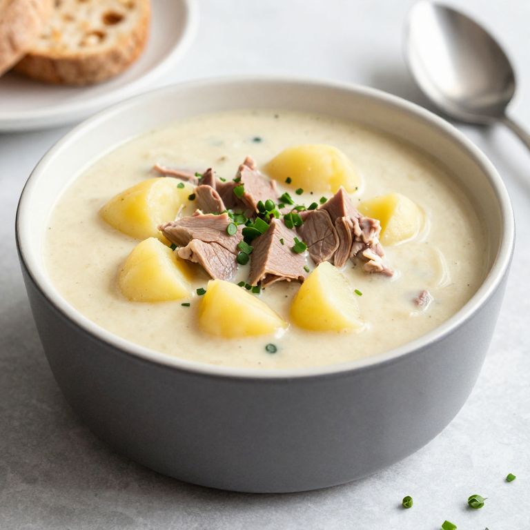 Rich Ham and Potato Chowder, garnished with fresh parsley, sits invitingly in a vibrant red ceramic bowl, accompanied by a lemon wedge and cheese block on the side, ready to be enjoyed.