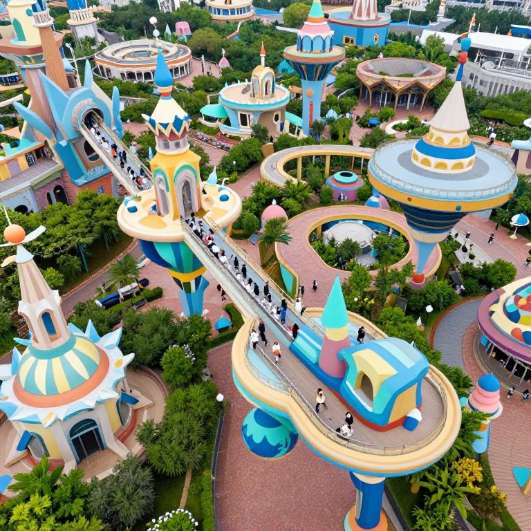 An aerial view of an ethereal theme park reveals a landscape teeming with whimsical architecture, where levitating platforms glide visitors through dreamlike structures that challenge conventional geometry. The artwork's palette is vibrant and detailed, rendering textures on attire and skin with hyperrealistic finesse in this surreal setting, juxtaposing the exhilaration of aerial movement against fantastical edifices below to evoke fascination and awe.