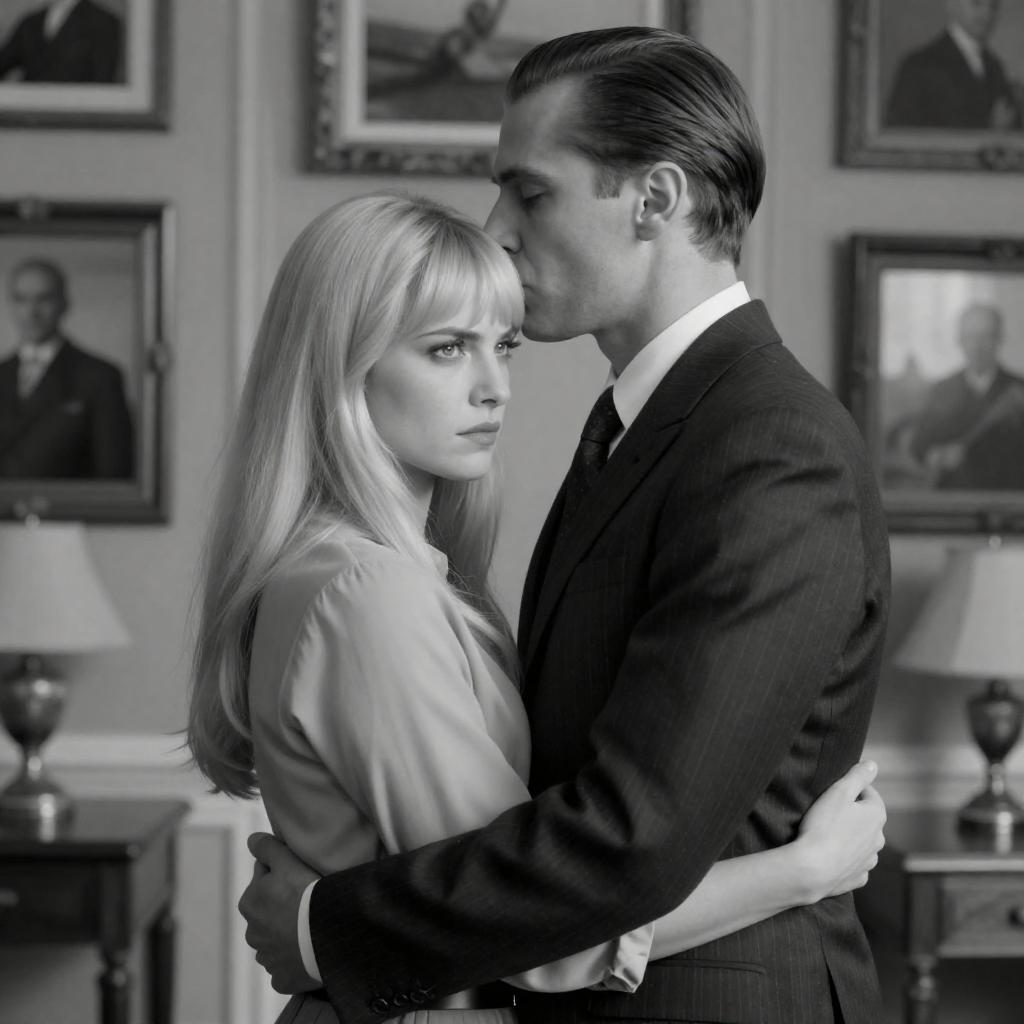 Black-and-white photograph of a vintage room with ornate wallpaper and a chandelier. A nude woman with long, wavy blonde hair stands with her back to the camera, facing a man in a suit standing near a fireplace. Another man in a hat sits at a table, writing. The room has framed pictures, a mirror, and a window with lace curtains.