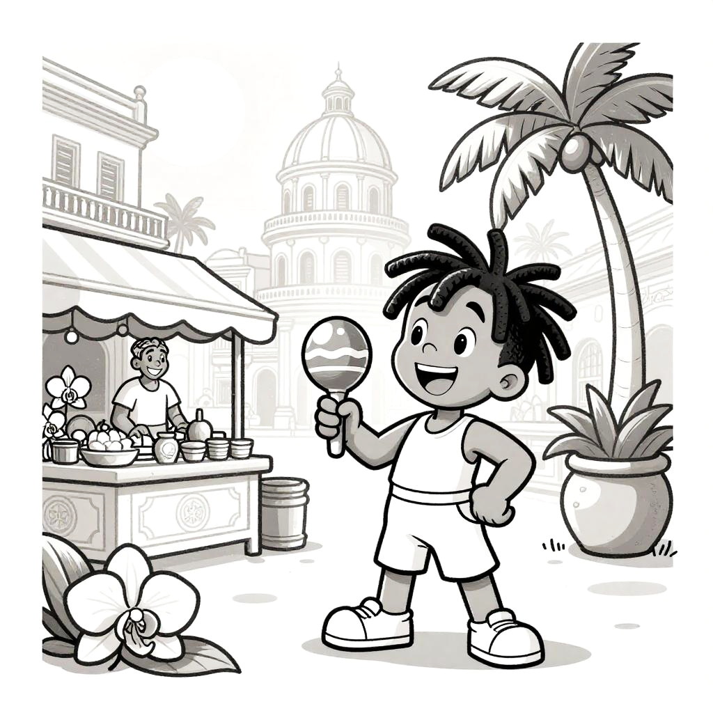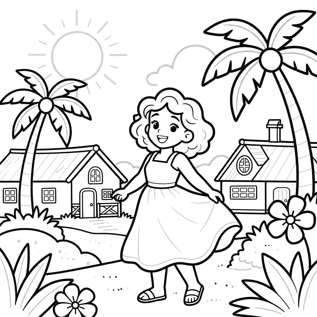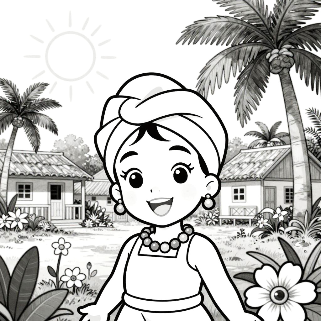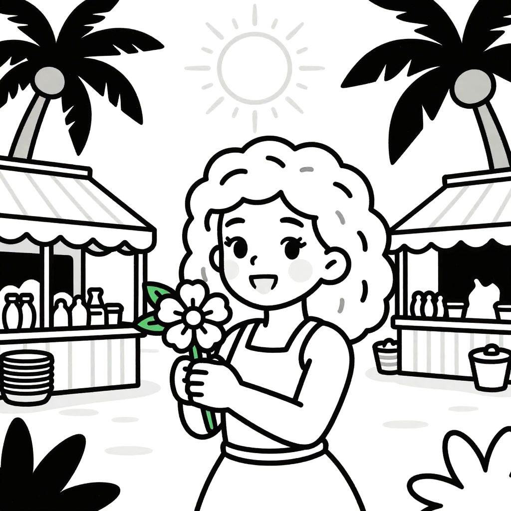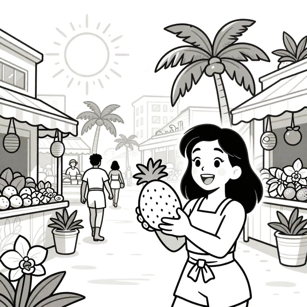 Bright pop art style line drawing, white background and drawing outline only, set in a bustling Caribbean market street, featuring a joyful girl holding tropical fruits in her hands, Disney-style drawing with sun shining, palm trees and lush orchids, thick black outlines.