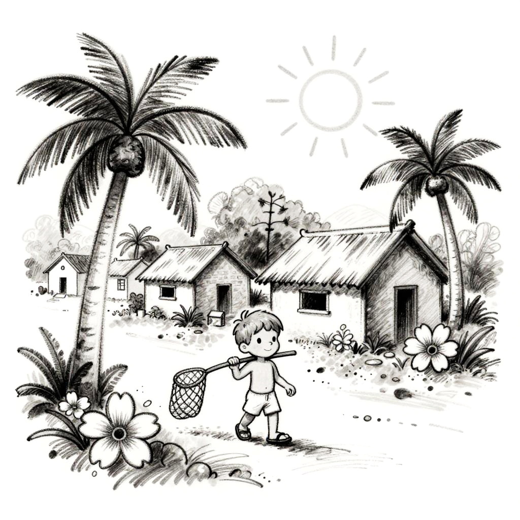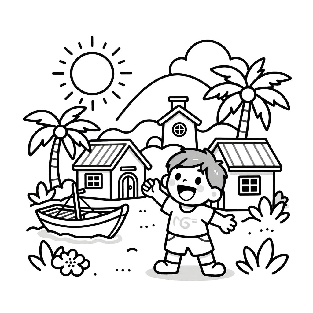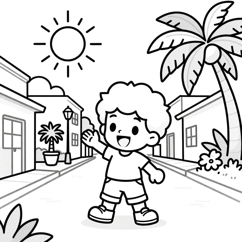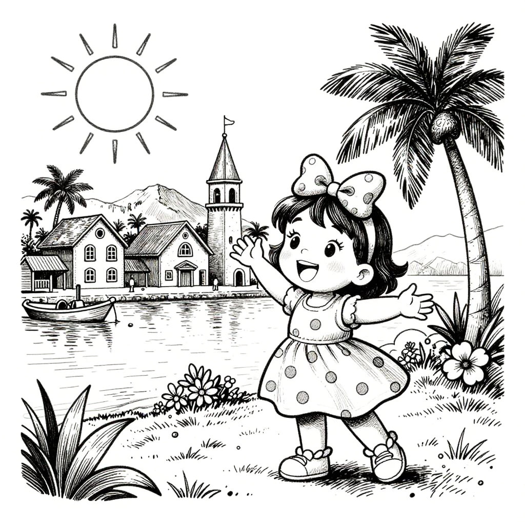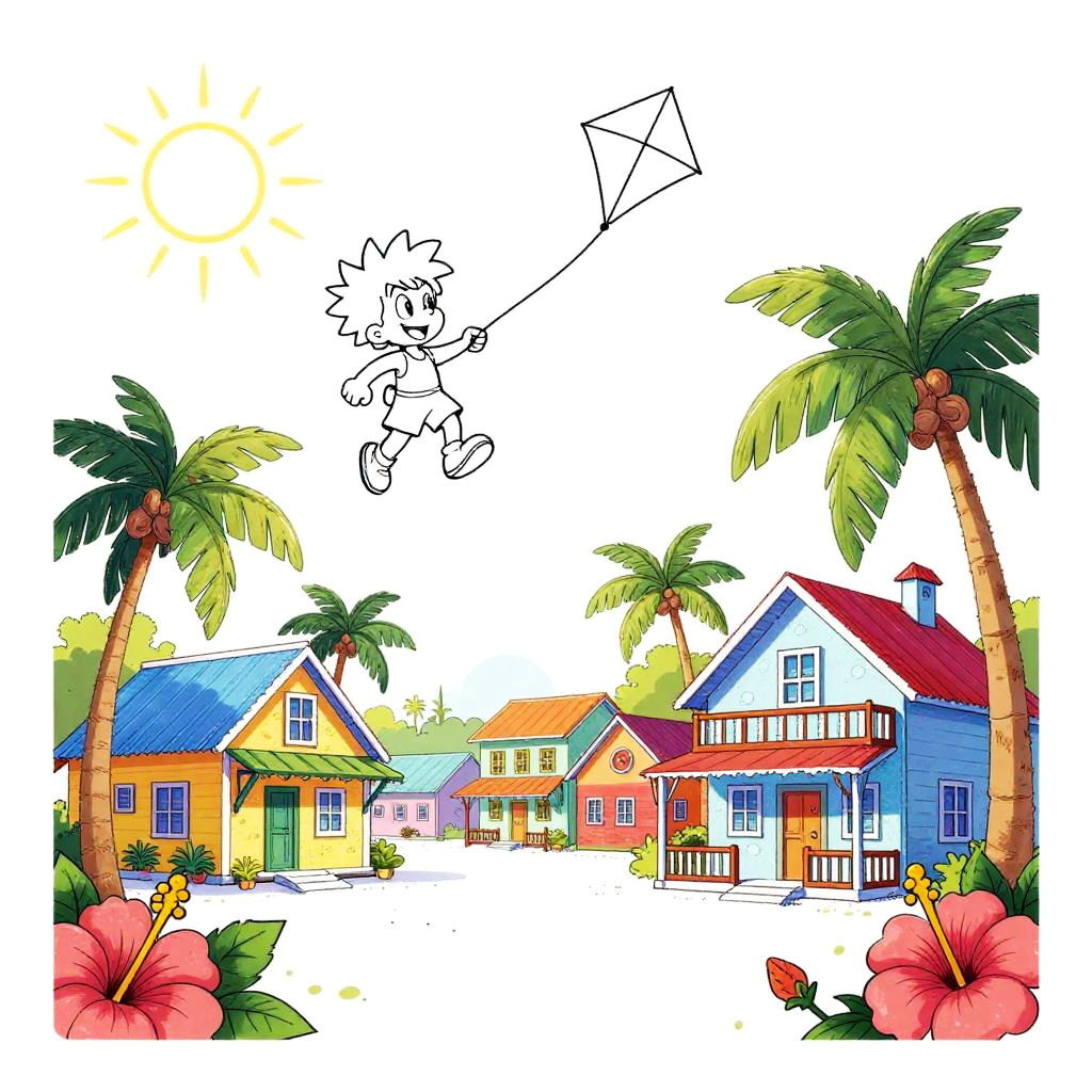 Bright pop art style line drawing, white background and drawing outline only, set in a bustling Caribbean market street, featuring a joyful girl holding tropical fruits in her hands, Disney-style drawing with sun shining, palm trees and lush orchids, thick black outlines.