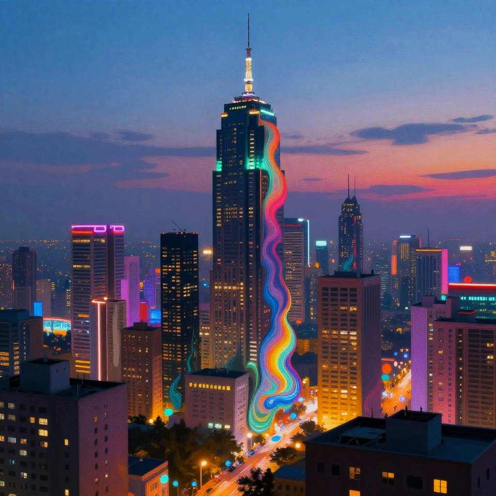AI art filter transforming a cityscape into a vibrant, surreal painting with neon colors and fluid brushstrokes, blending technology and creativity under a twilight sky, digital art style with high detail and dynamic lighting.