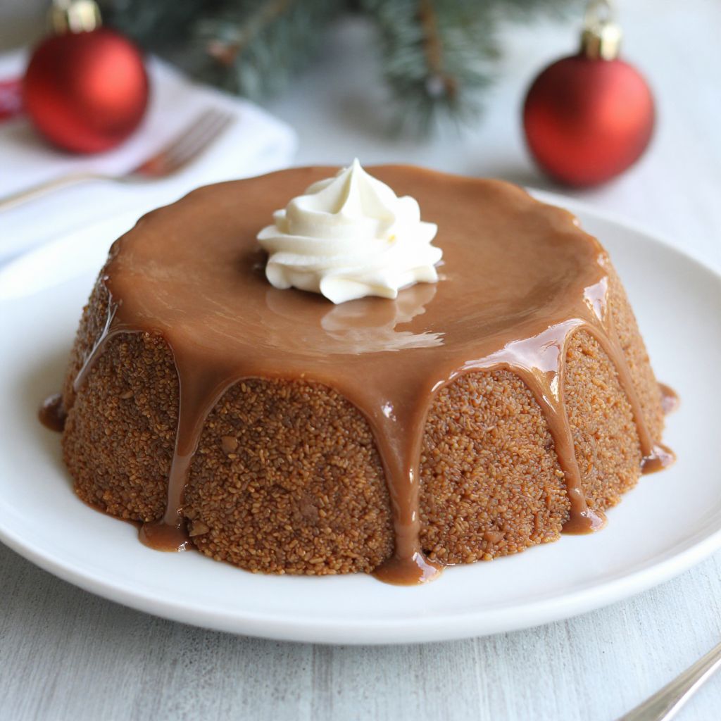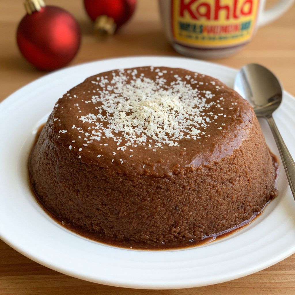 Photograph of a round, chocolate cake with a glossy, smooth top, sprinkled with white sugar crystals. The cake sits on a white plate with a silver spoon on the right. In the background, there are two red Christmas ornaments and a yellow and red can of Kahula macadamia nut syrup. The wooden table surface adds a warm, rustic feel to the scene. The lighting highlights the cake's moist texture and rich color.