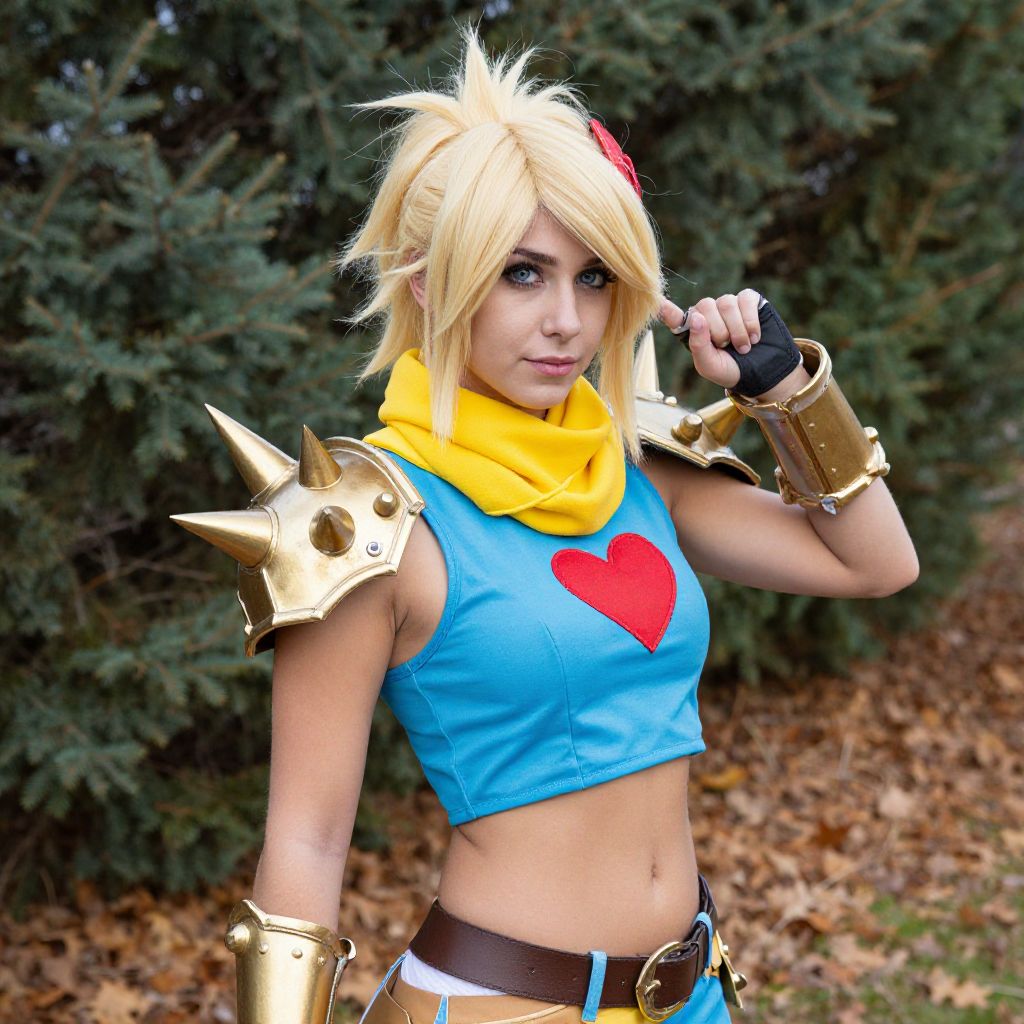 A woman dressed in a vibrant cosplay outfit poses outdoors among fallen leaves and evergreen trees. She sports a spiked blonde wig, a bright yellow scarf, gold spiked shoulder armor, and a blue crop top emblazoned with a red heart, capturing a dynamic and stylized fantasy look.