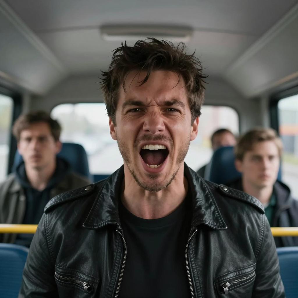 A young Caucasian man with short, slightly messy dark hair and a light beard is shouting with his mouth open. He is wearing a black leather jacket and a black shirt. The man is centered in the foreground inside a bus with metal walls, blue-tinted windows, and overhead lighting. Two other young men, slightly out of focus, are seated behind him, wearing casual clothing. The image captures a tense moment in a public transportation setting.