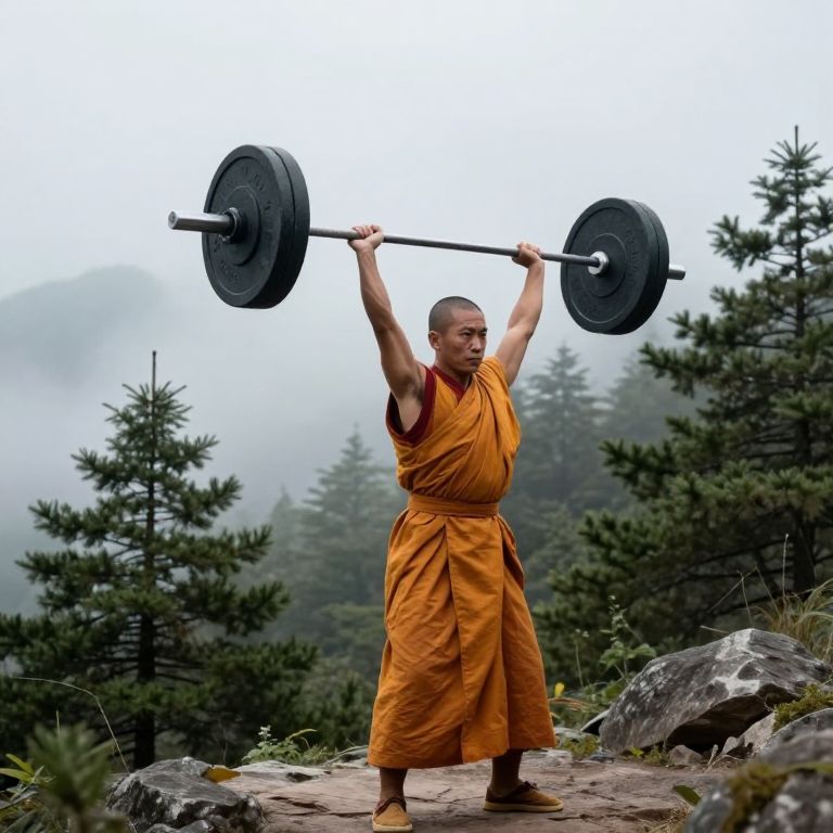 Monk Lifting Barbell in Misty Mountains