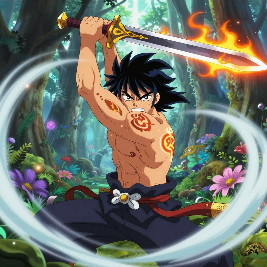 Blue Haired Anime Warrior Mid-Leap with Glowing Katana