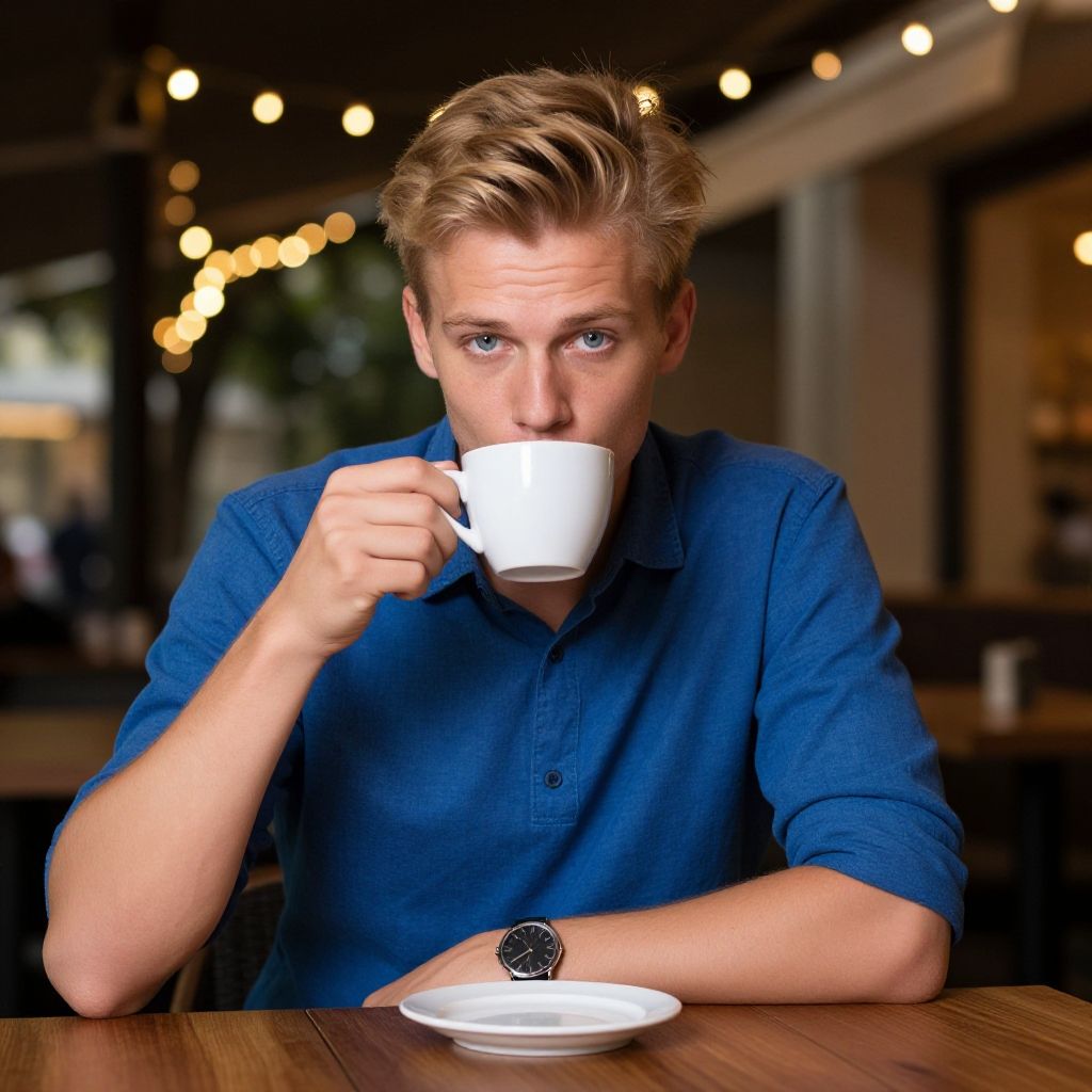 A formal dress man sits at a vintage leather desk in a luxurious office, sipping black coffee, wearing a deep gray suit and a vest, subtle gold watch, warm interior lighting, rich textures, professional atmosphere, MidJourney style.