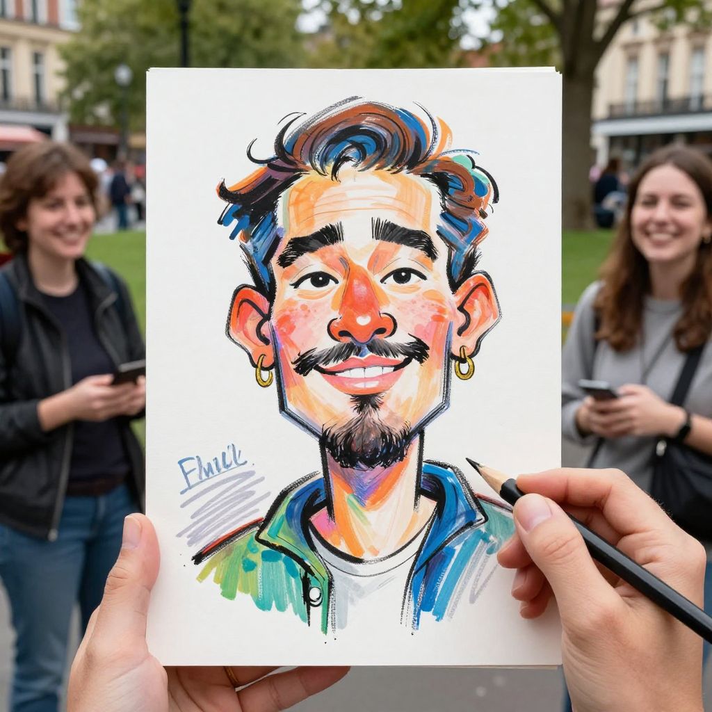 Characture drawing of a lively street artist sketching caricatures, vibrant colors, exaggerated facial features, dynamic brush strokes, humorous and expressive style, set in a bustling urban park with onlookers smiling and reacting, daylight ambiance