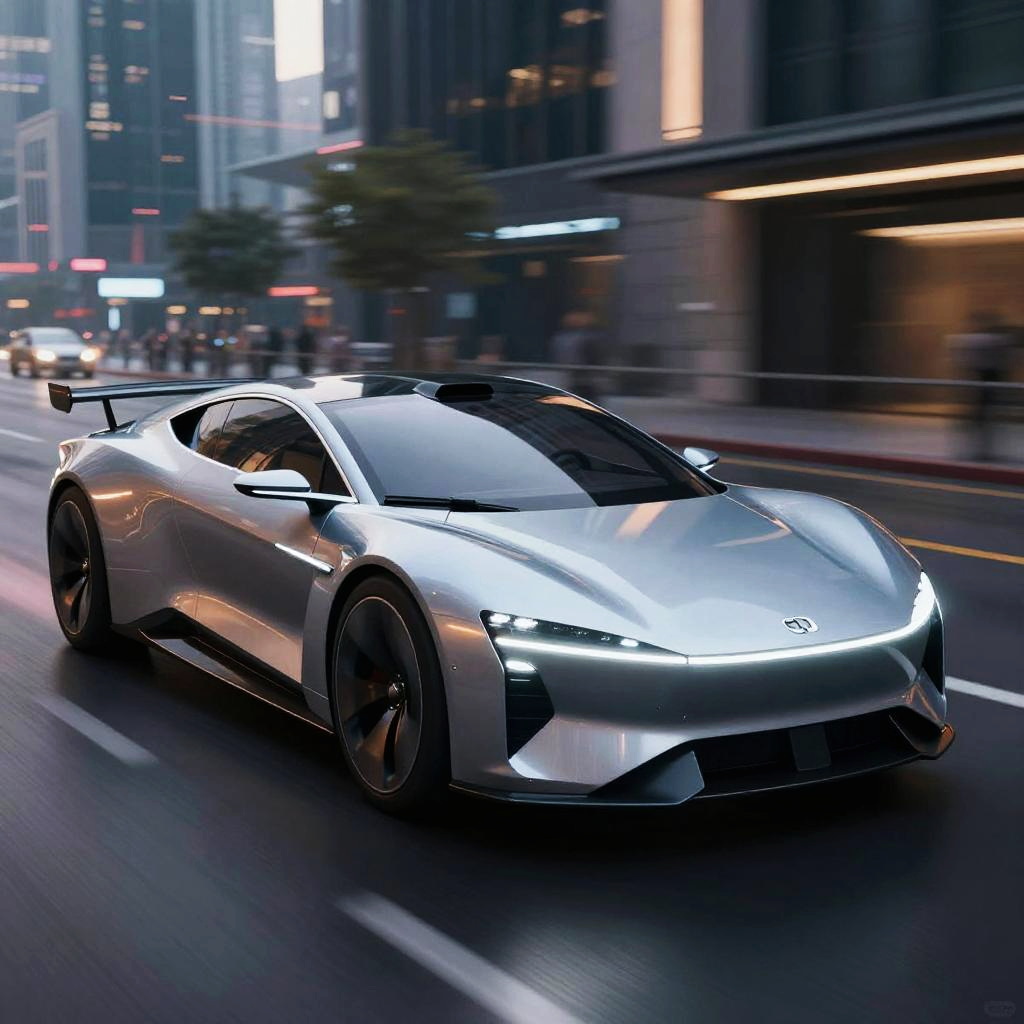 Free AI car design generator producing advanced concept car with sharp lines, smooth surfaces, metallic finish, integrated smart technology, dynamic lighting, concept art in cyberpunk city background, HD rendering with vivid colors