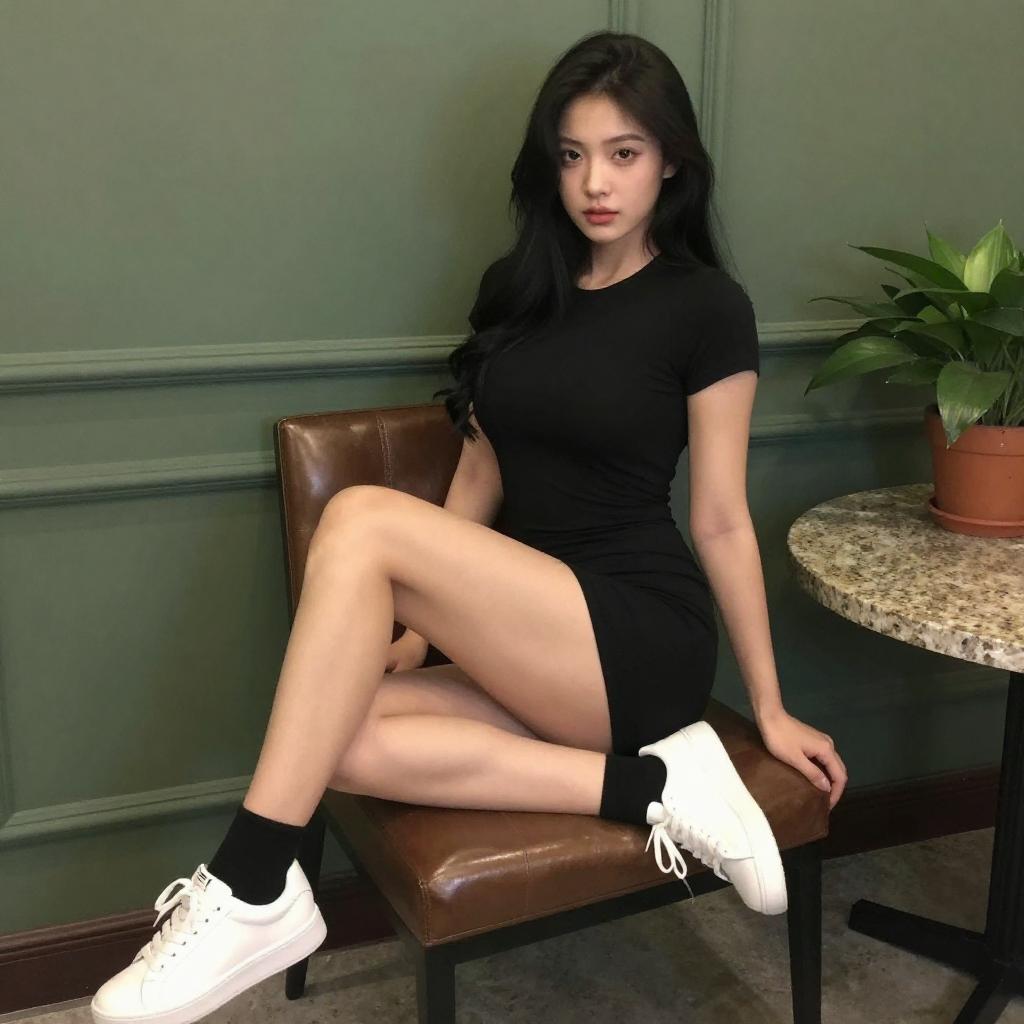 Photograph of a young woman with long black hair, fair skin, and blue eyes, sitting on a white chair in a dimly lit studio. She wears a black, long-sleeve, button-up shirt with large cutouts revealing her cleavage and black shorts. Her legs are crossed, and she touches her hair with both hands. The background includes a cluttered table with makeup items, a mirror, and a white wall.