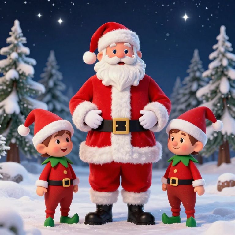 Jovial Santa Claus, flanked by mischievous elves with pointed ears and Santa hats, stands against a starlit winter night, embodying the whimsical magic of Christmas in a surreal, dreamlike tableau.