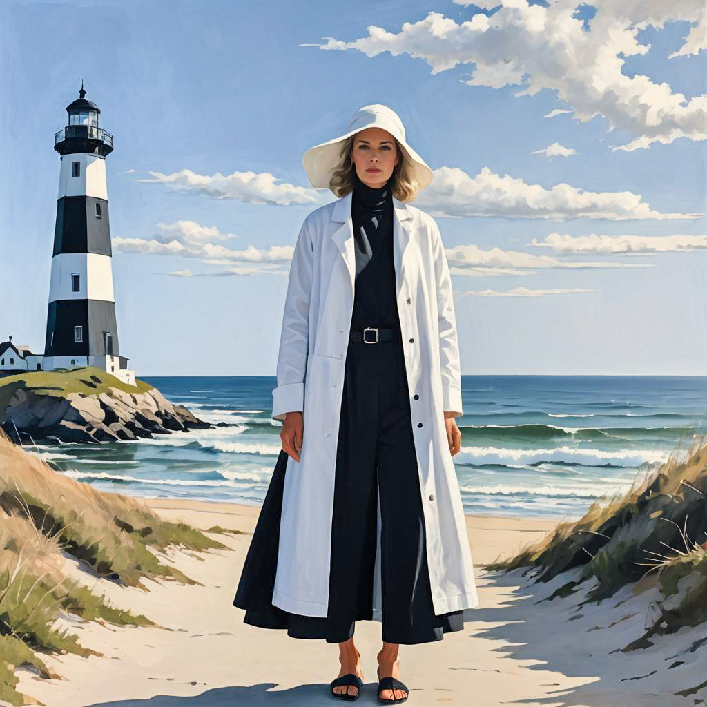 Portrait of an inverted triangle body-shaped woman with wavy lob hairstyle wearing a modern nun-inspired outfit. She stands on a sandy coastal path near a black and white striped lighthouse, dressed in a black brushed cotton habit, long business grey robe, white linen coif, and dressy black sandals. The background features a blue ocean, gentle waves, and partly cloudy sky rendered in an abstract artistic style.