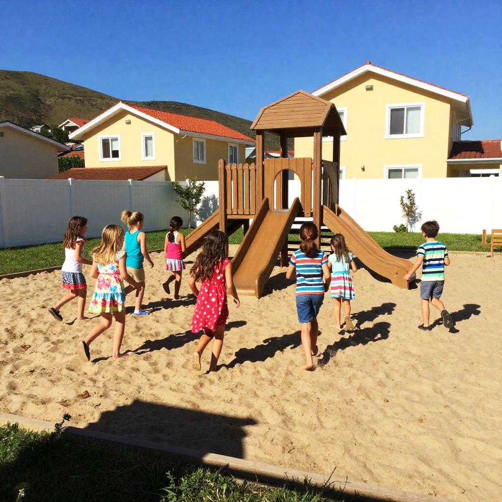 Photograph of a sunny backyard playground with a sandy surface. Seven children, mostly girls, in colorful dresses and one boy in striped shirt, are running away from the camera towards a wooden slide. Background features yellow house, white fence, and hills with houses. Bright blue sky overhead. Kids' shadows are cast on the sandy ground, adding depth to the image.