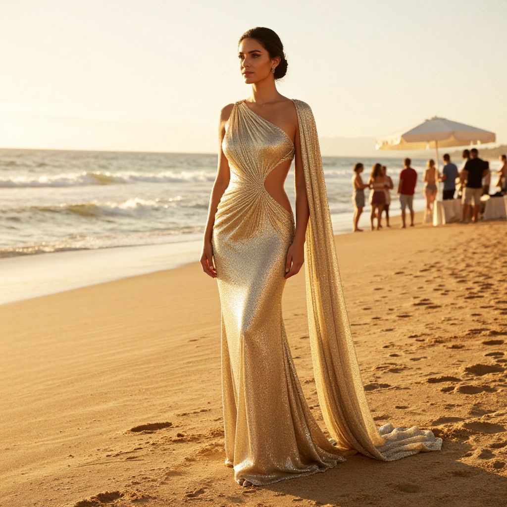 Photograph of a slender woman standing on a golden-hued sandy beach at sunset. She wears a shimmering, one-shoulder, gold sequin gown with a long, flowing sleeve and cut-out sides, reflecting the sunlight. Her dark hair is styled in an elegant updo. In the background, a group of people, some in swimsuits, are gathered near the water's edge, under a white umbrella. The ocean waves gently lap the shore, with the sun casting a warm, golden glow over the entire scene.