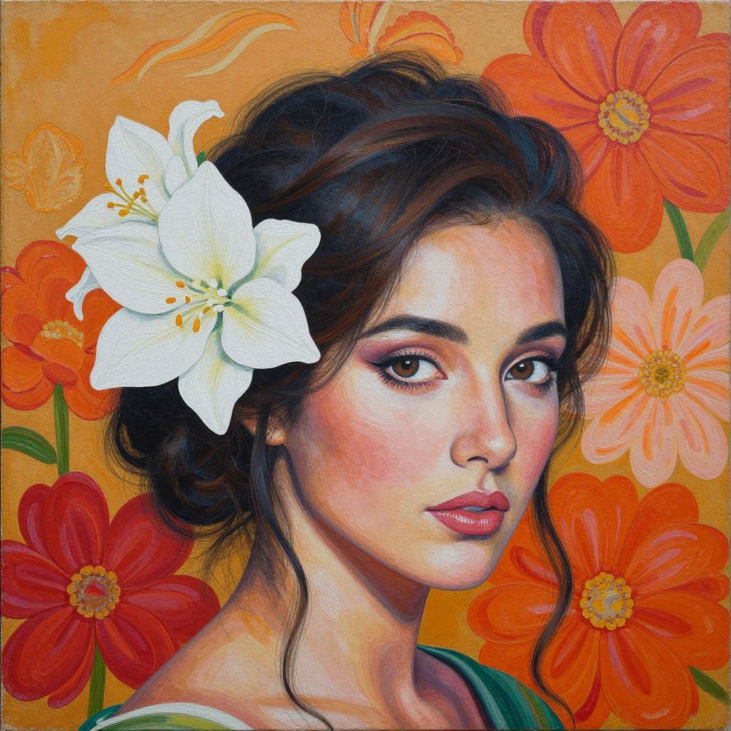 Vibrant mixed-media artwork featuring a detailed portrait of a woman with intricately styled dark hair adorned by a large white flower, set against a warm, floral background with orange and red blooms.