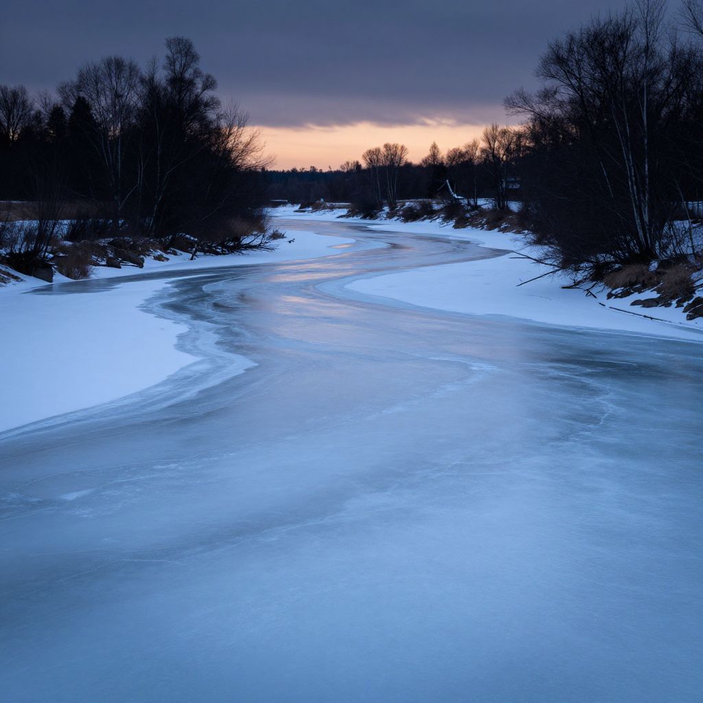 Photograph of a frozen river at sunset. The river, covered in a thick layer of ice, reflects a blue hue from the sky. Bare, leafless trees line both sides of the river, silhouetted against a darkening, cloudy sky. The horizon shows a faint orange glow from the setting sun. The ice has a smooth, glass-like texture with subtle cracks. The landscape is mostly flat, with a mix of snow and ice covering the ground. The overall scene is tranquil and cold, capturing the serene beauty of a winter landscape.