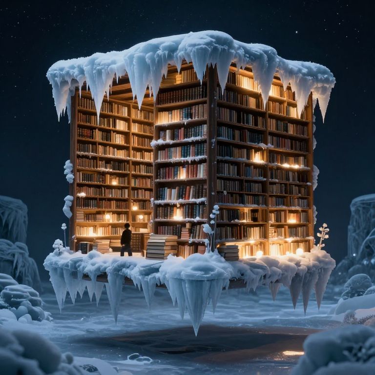 Suspended in the void, a luminous library cradled by icy embrace invites introspection, its flickering lights casting warmth amidst the cold expanse, where knowledge and wonder converge in a sanctuary of infinite possibility.