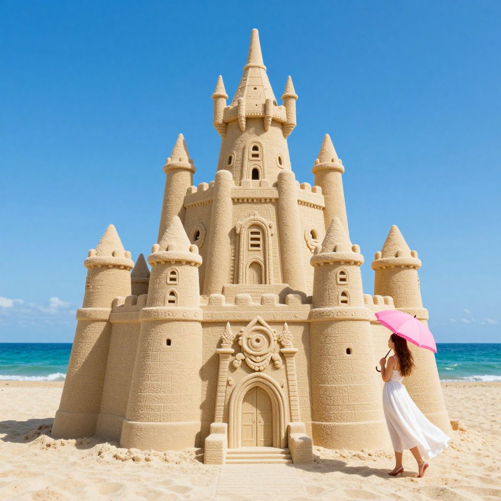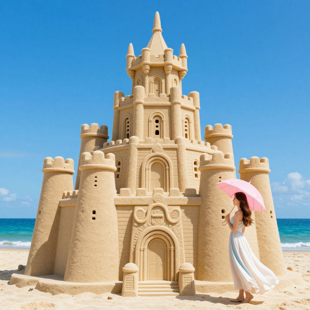 A stunning 3D-rendered beach scene showcases a towering sandcastle with intricate architectural details, reminiscent of medieval castles, set against a vibrant blue sky and turquoise ocean, with a woman in a flowing dress holding a pink parasol adding a whimsical touch to the high-definition, digital art composition.