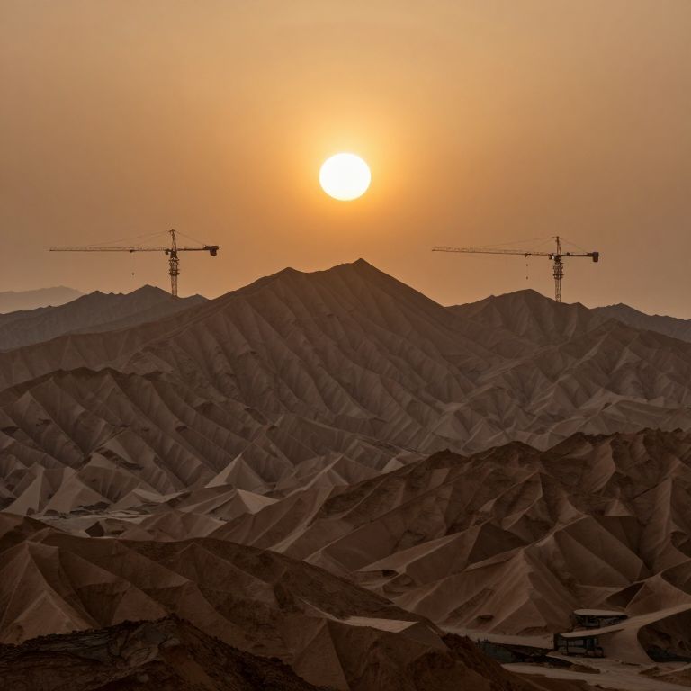 Photograph of a desert landscape at sunset. The sky is a gradient of orange and yellow, with the sun glowing brightly in the center. Silhouetted against the sun are two construction cranes on distant hills. The foreground features rugged, brown desert mountains with sharp, angular peaks and ridges. The cranes are evenly spaced on either side of the sun, adding an industrial element to the natural setting. The overall composition contrasts the natural beauty of the desert with the man-made structures. The colors are warm and the lighting is soft, creating a serene yet stark atmosphere.