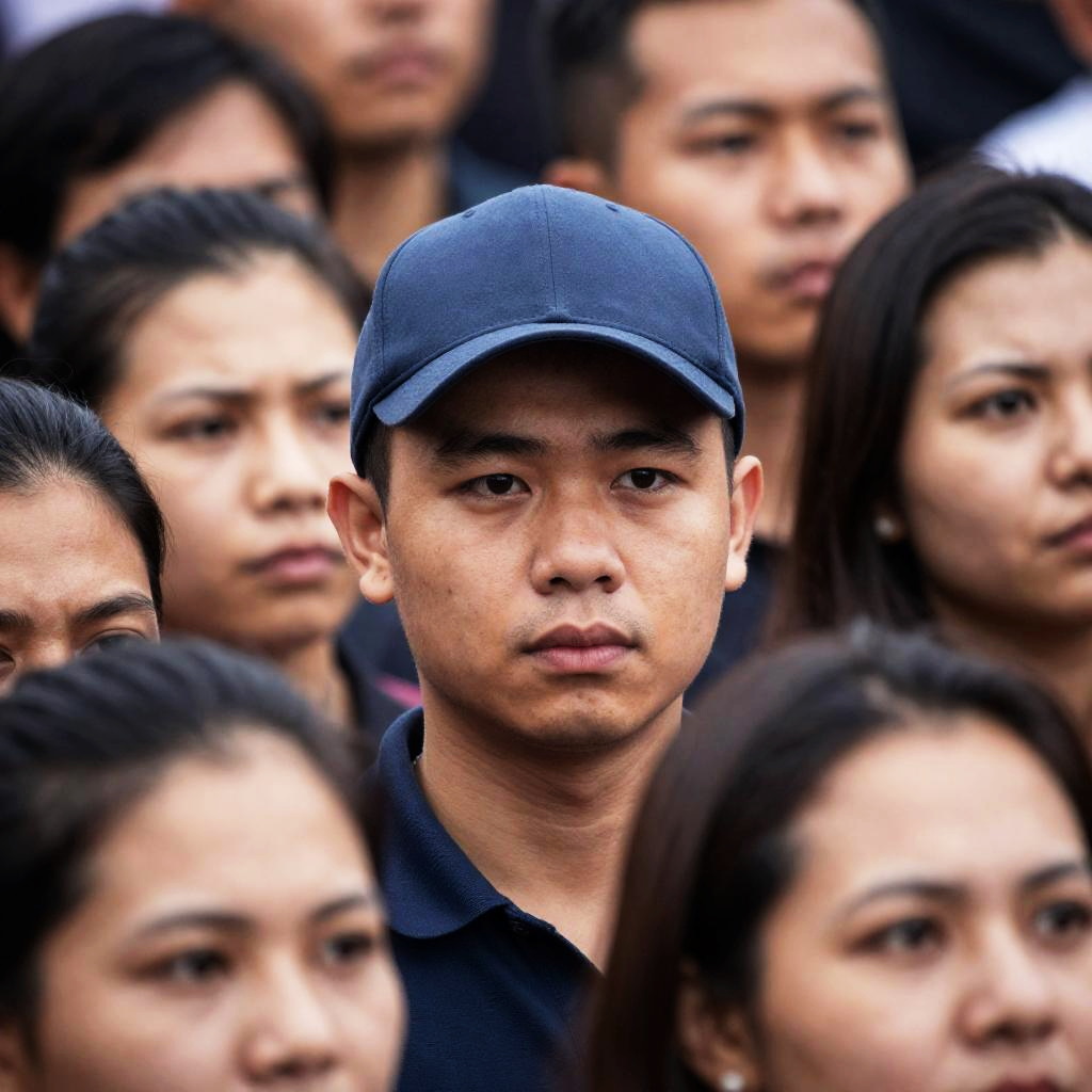 Photograph of a crowded scene. Central male with fair skin, blue hat, blue shirt, looking slightly to the side. Surrounding people with varied hair colors and expressions. Background blurred, focusing on the central figure. Intense expressions visible.