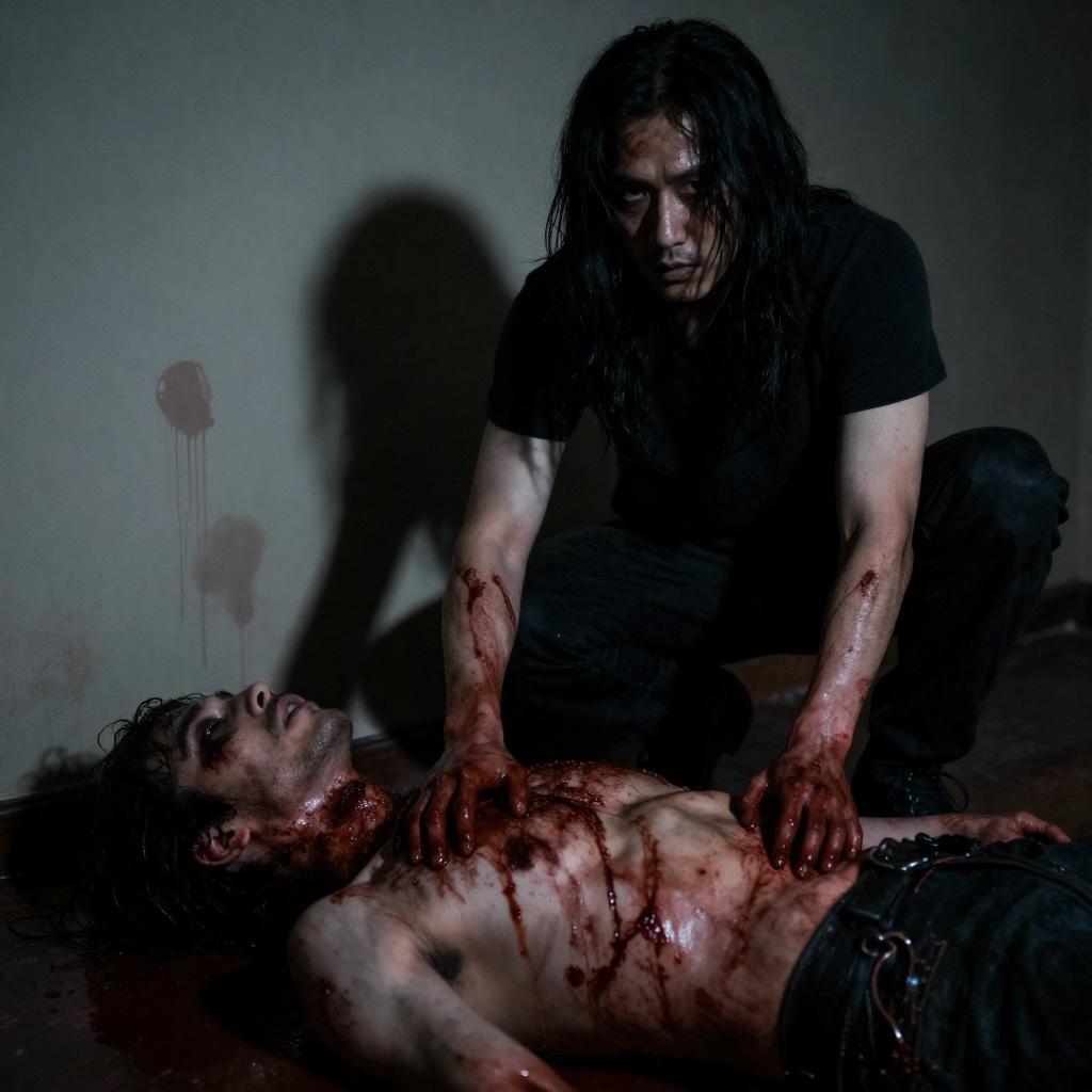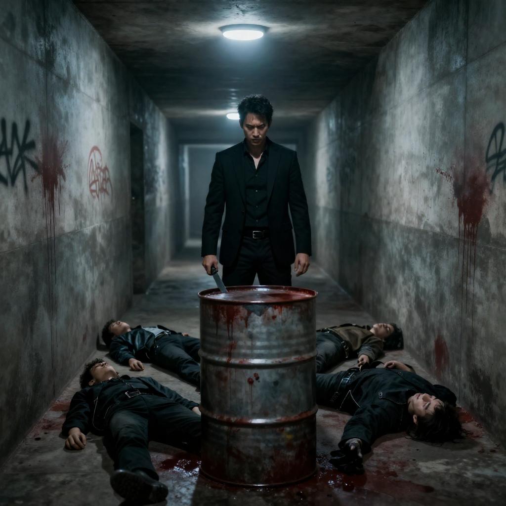 Photograph of a dimly lit, blood-stained, concrete hallway. A stern-looking man in a black suit and shirt stands in the center, holding a knife. Four unconscious or dead people lie on the floor and on a large cylindrical metal drum. The walls are covered in blood stains and graffiti. Overhead lighting casts a blueish tint.