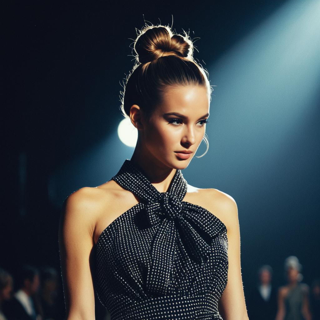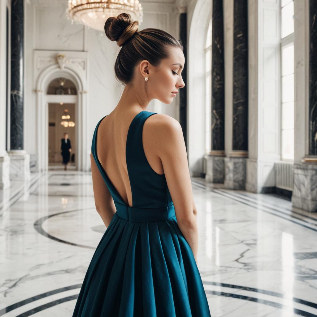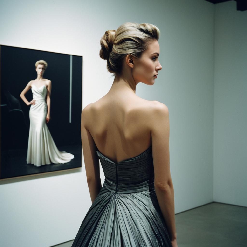 Side Bun hairstyle on woman, wearing elegant evening gown, in modern art gallery, captured in fashion editorial style with soft diffused spotlight.