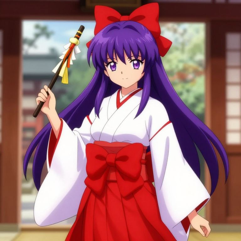 Digital illustration of an anime-style Japanese shrine maiden (miko) with long purple hair and purple eyes. She is wearing a traditional white kimono with wide sleeves, a red hakama tied with a large red bow at the waist, and a large red hair bow. The character holds a gohei, a ceremonial wooden wand with paper streamers, standing near a wooden doorway with a blurred outdoor background. The style is detailed and vibrant, inspired by Touhou and Hakurei Reimu (PC-98).