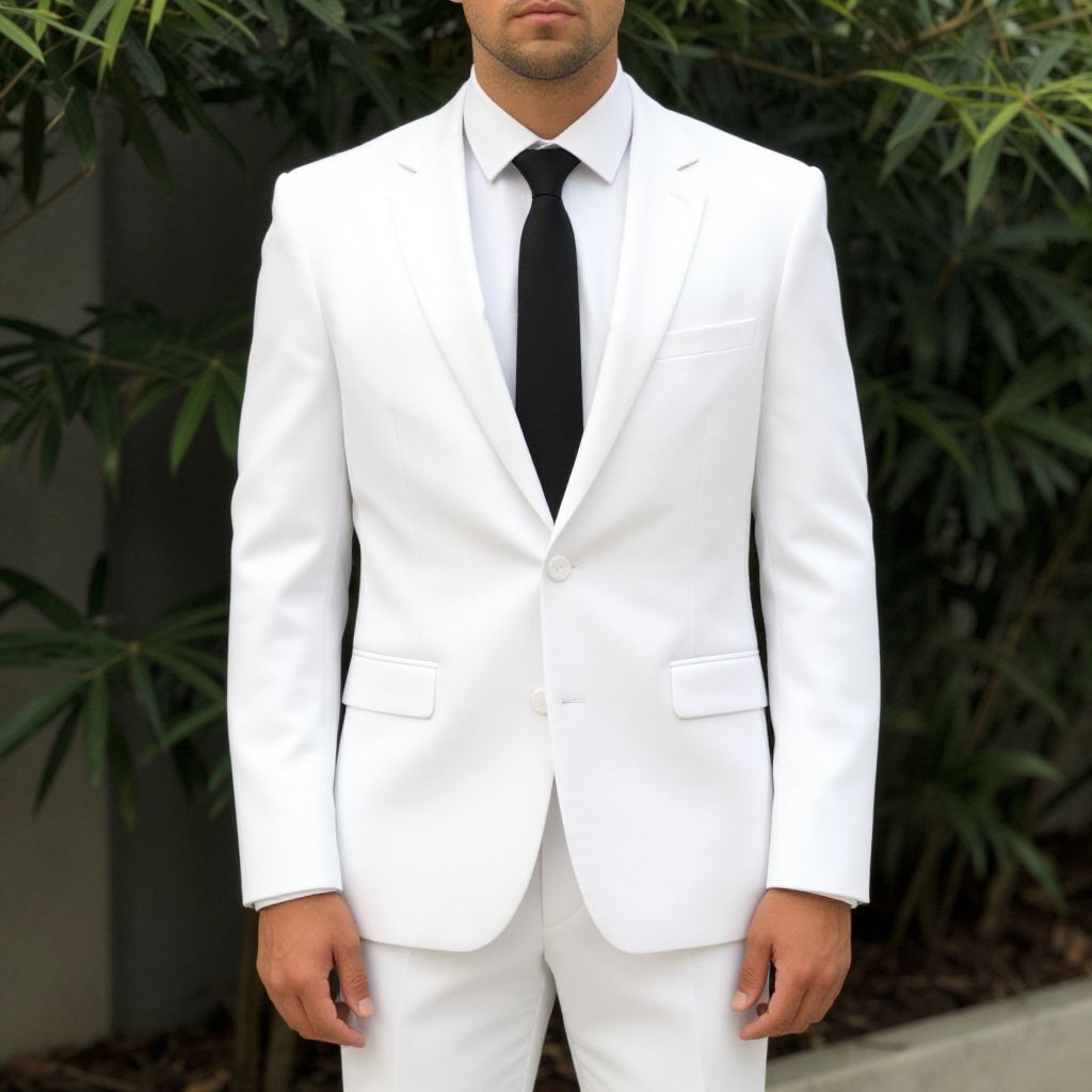 Photograph of a man from neck to upper thighs, standing against a backdrop of dark green bamboo leaves. He wears a sharp, white, single-breasted suit with a black tie, contrasting against his light brown skin. The suit has a classic, tailored fit with straight lapels and side pockets. His face is partially visible, showing a trimmed beard and short hair. The background is slightly blurred, emphasizing the man's outfit. The overall style is modern and formal, with a minimalist, monochromatic color palette.