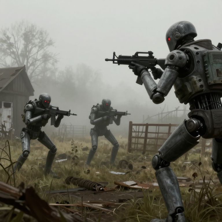 Time-Lapse killer androids searching an abandoned farm, armed with stolen military weaponry, foggy weather, red glowing eyes, high detail, Thomas Kincade style,