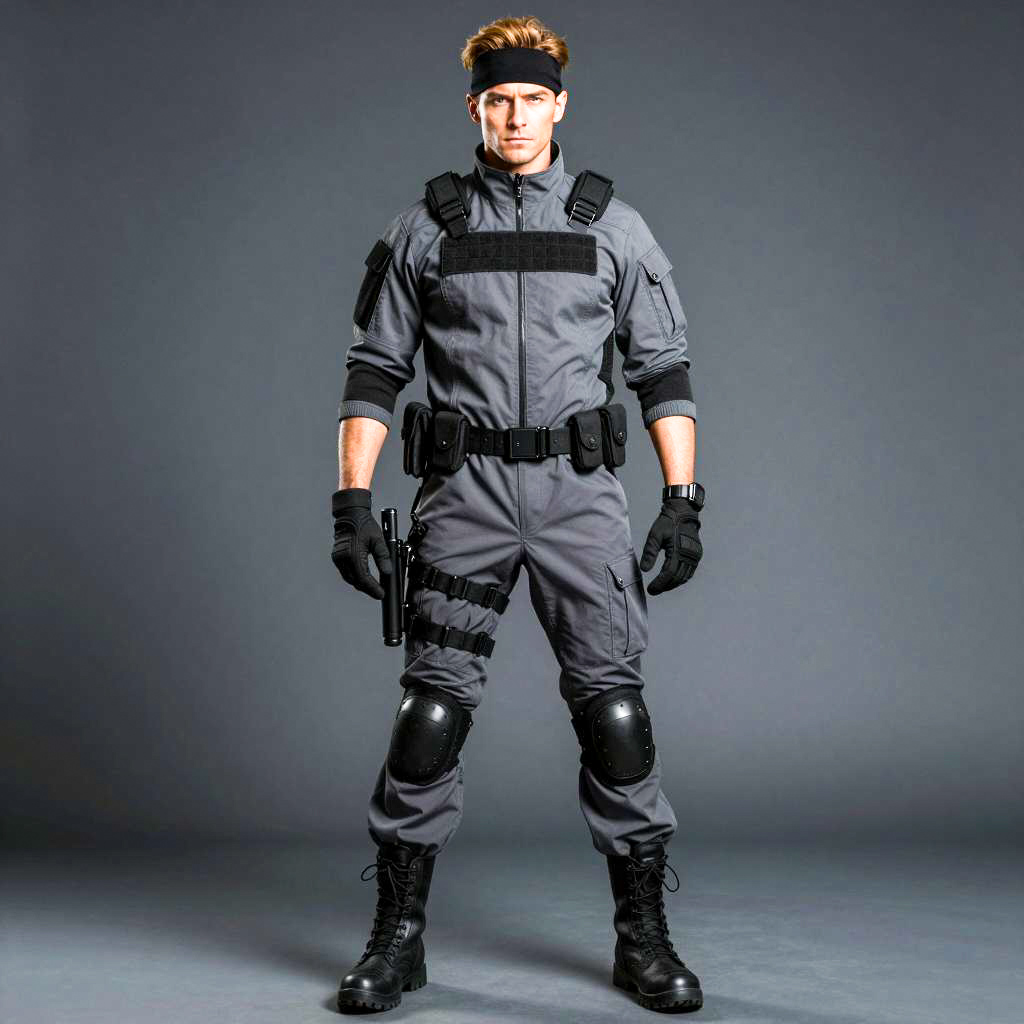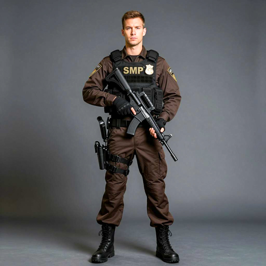 Swat jumpsuit costume plus, photograph of a male police officer standing, front view, full body, brown uniform, black tactical vest with "SMP" , holding black assault rifle, short brown hair, light skin, serious expression, plain dark gray background, studio lighting, military-style, realistic, no additional objects or details, centered composition