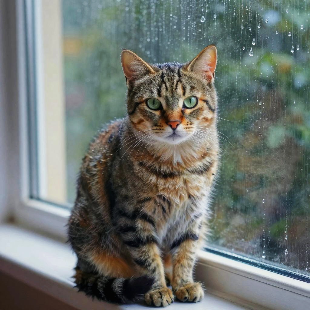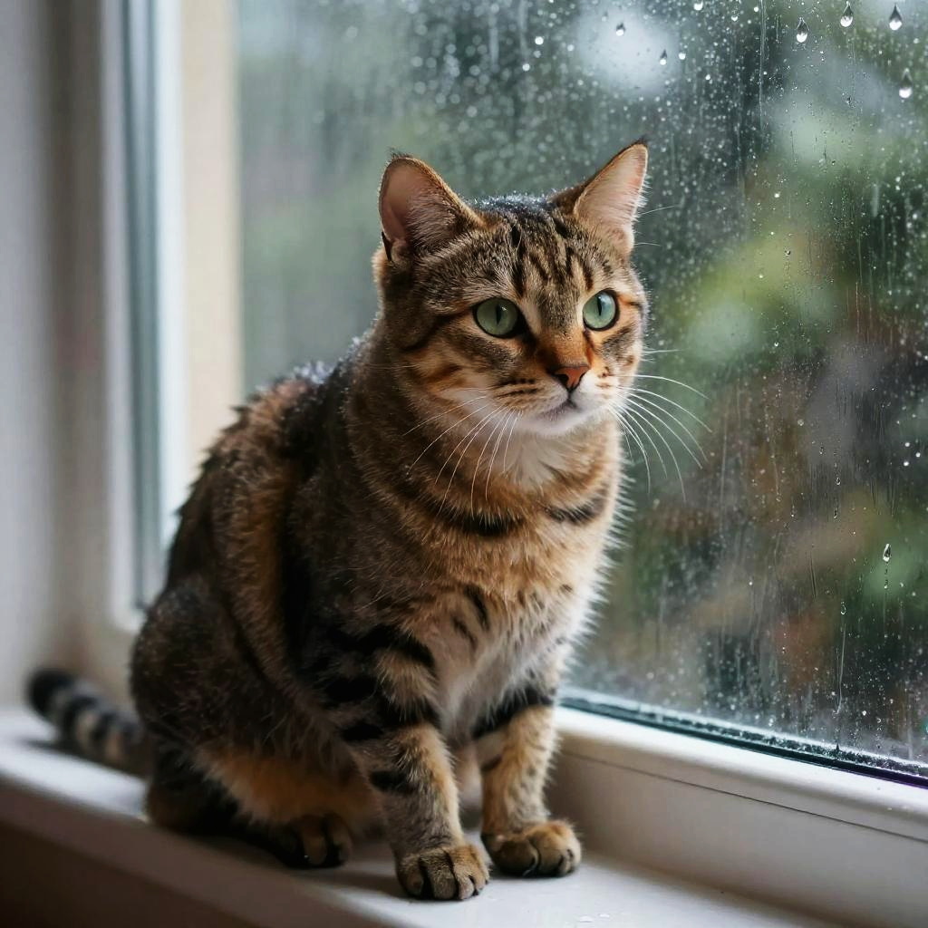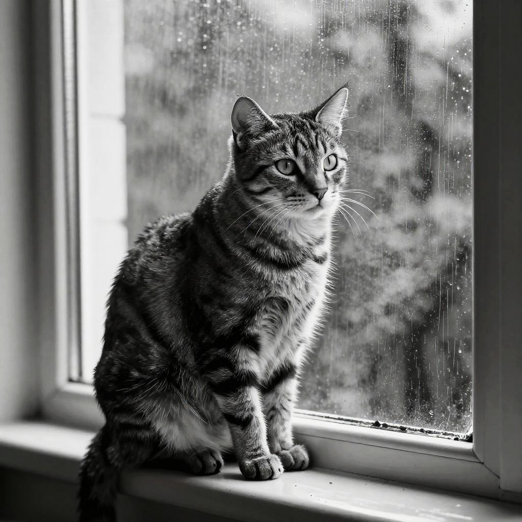 Cat perched in a windowsill on a rainy day, high contrast photography, fisheye lens, extreme close-up, stormy light with heavy rain splashes on glass, hyper detailed, highly realistic, intricate textures