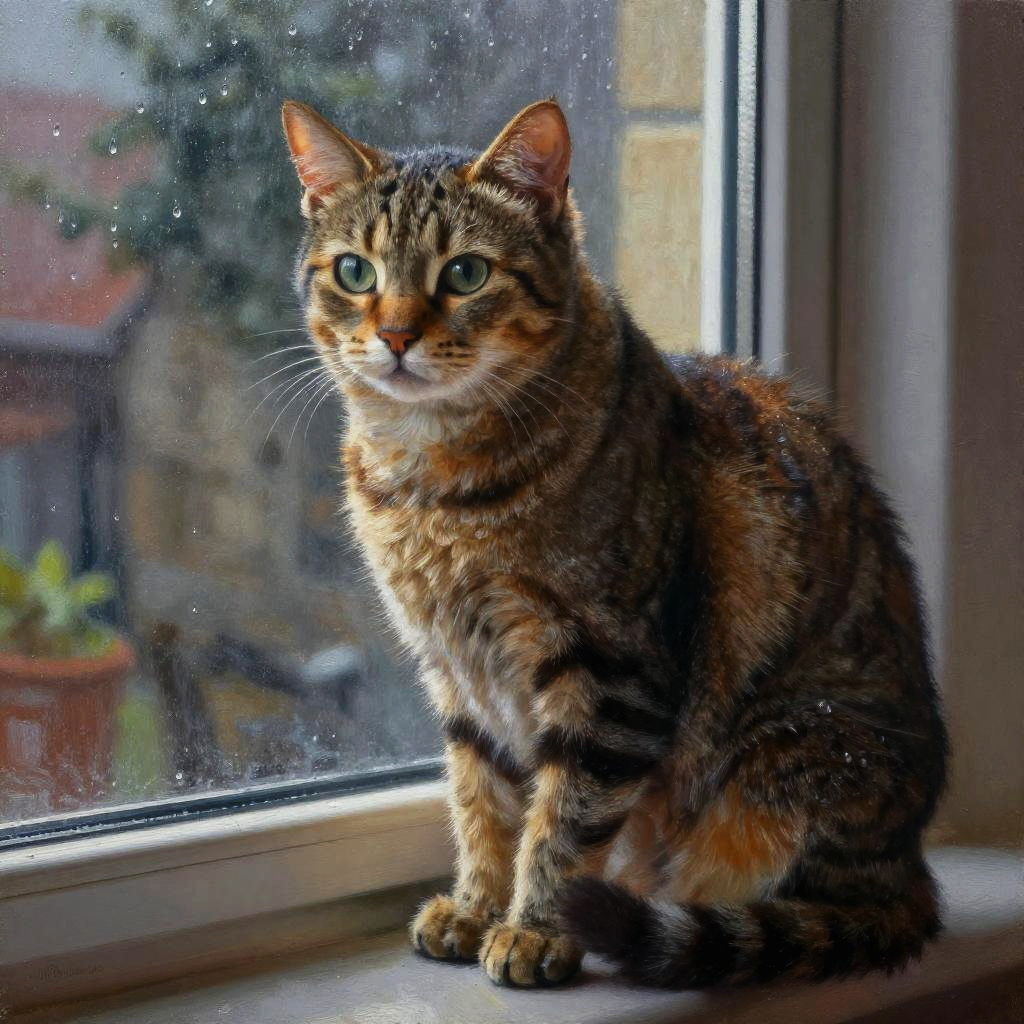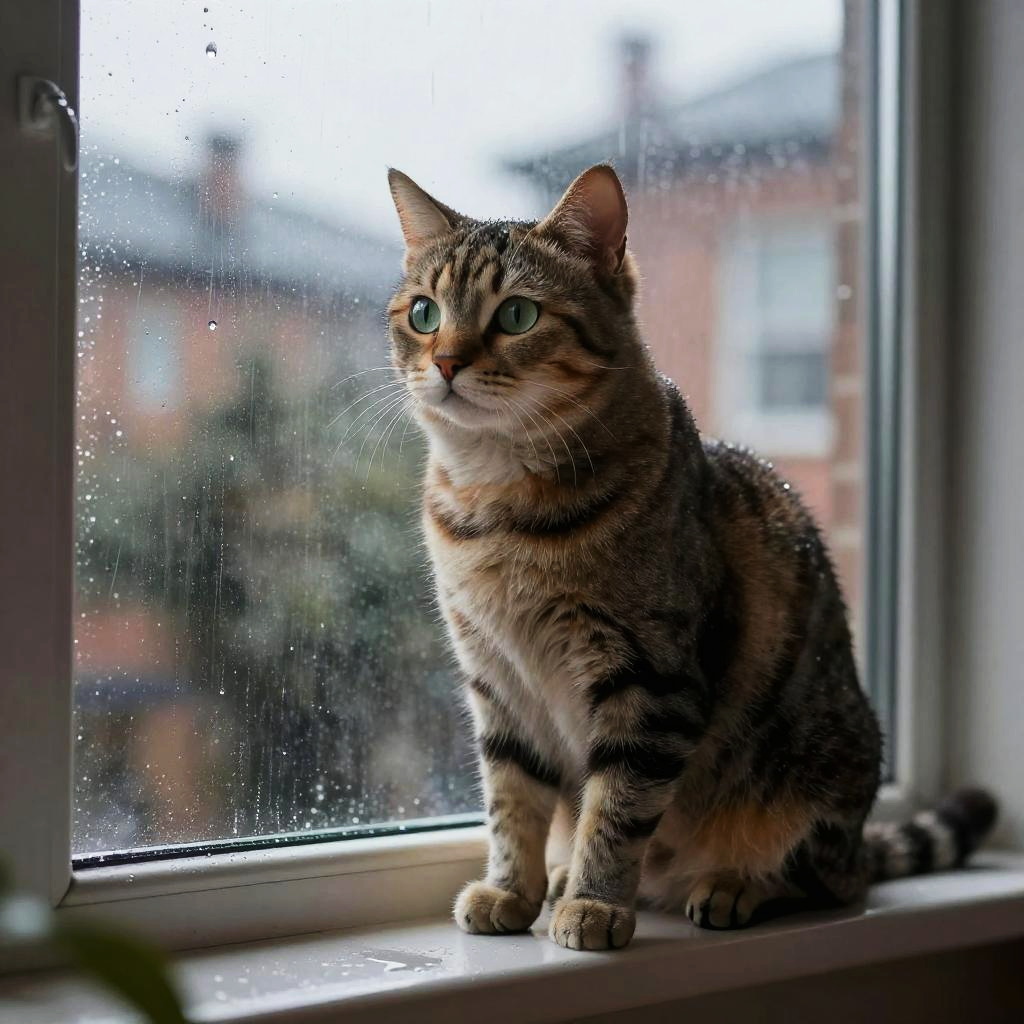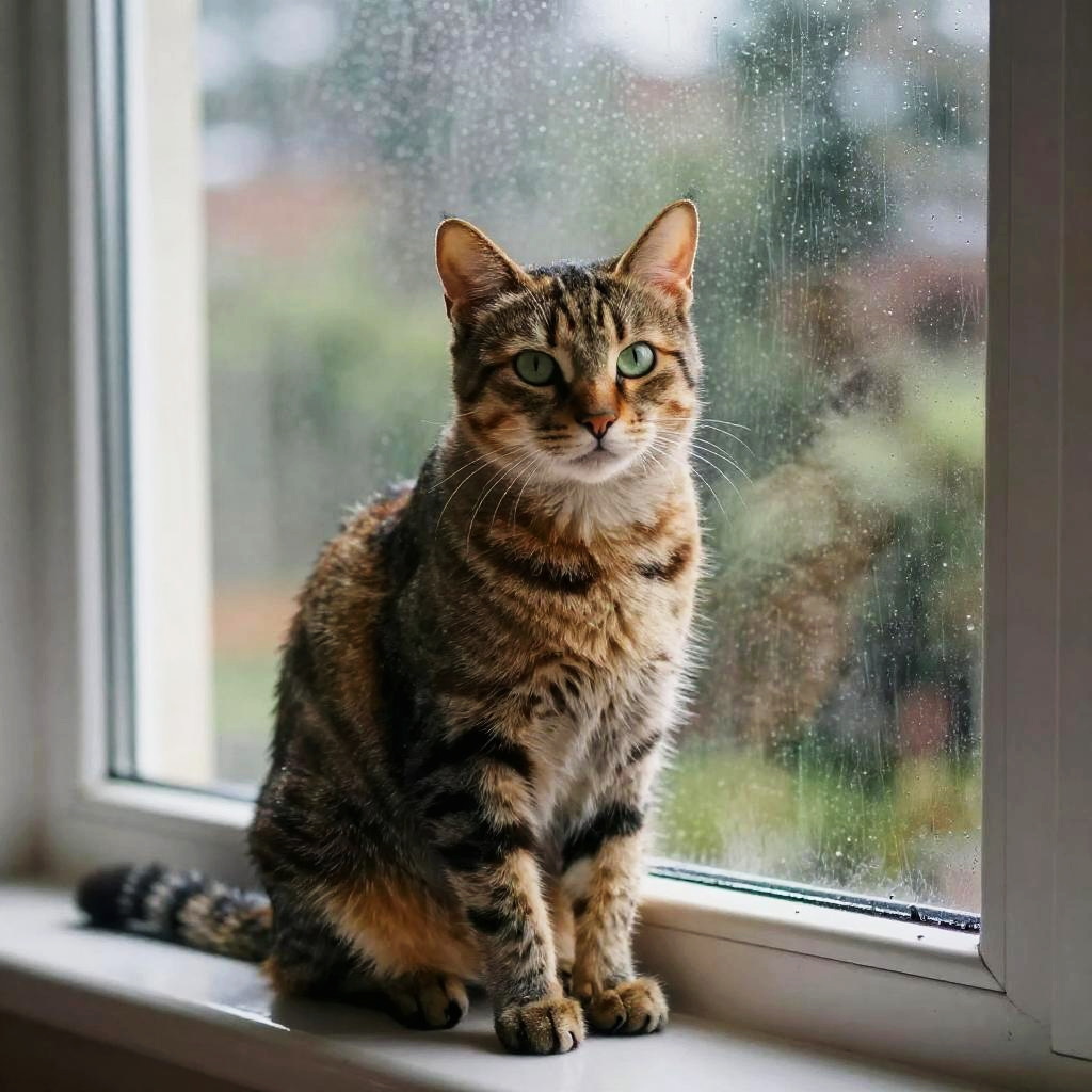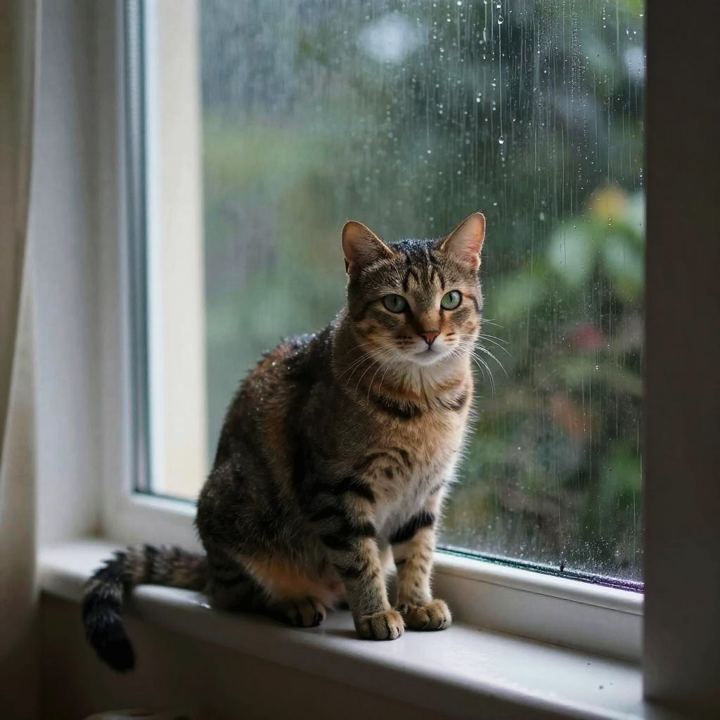 Cat perched in a windowsill on a rainy day, high contrast photography, fisheye lens, extreme close-up, stormy light with heavy rain splashes on glass, hyper detailed, highly realistic, intricate textures