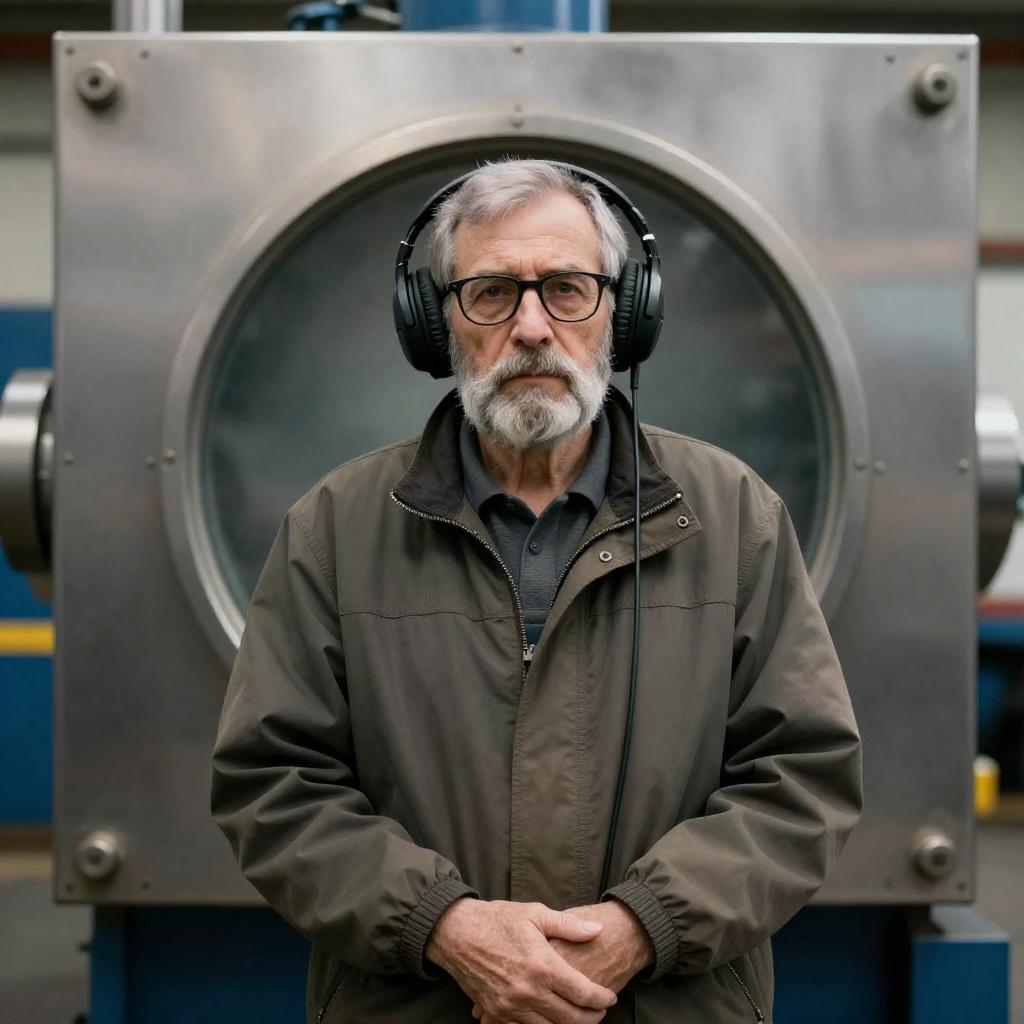 Old man with gray beard and glasses wearing black headphones and jacket stands in front of large metallic structure with circular openings. He has a serious expression, hands clasped in front. Background includes blue and metal elements. Industrial setting.